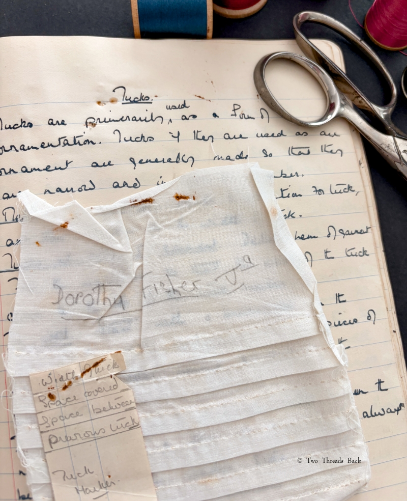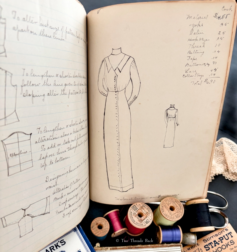 TIME. Eliza’s book is dated 1912-1913, and was compiled during her Home Economics Housekeeper’s Course at Kansas State Agricultural College. Dorothy’s book isn’t dated, but assuming the photo is of her and taken around the time she attended the class, it was probably made soon after Eliza’s. It seems they studied sewing at different ages, however. Dorothy was obviously still a young girl, while Eliza was over 30 when she completed her course, as census records show she was born in 1881.