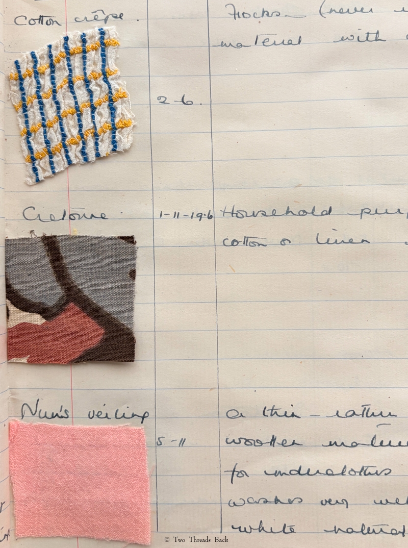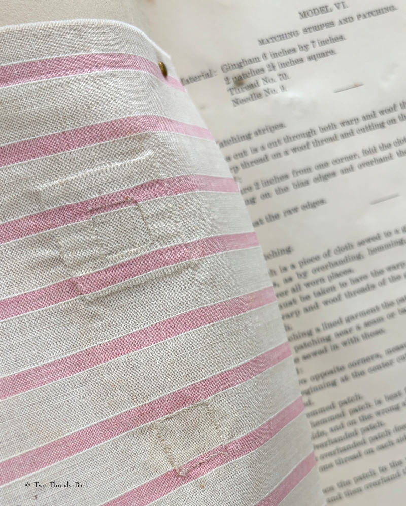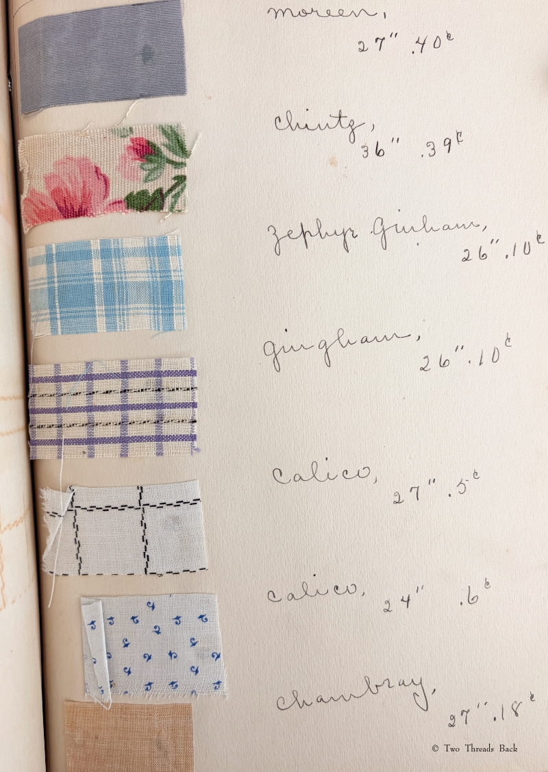 The fabric samples are my favorite part of early 1900s-era sewing books. “Extinct” (or nearly) names appear in catalogs, journals, and books from those days, and while research and historians provide helpful descriptions, there’s nothing quite like seeing and touching a tiny bit of the textile for myself. Tarantulle is longcloth – who knew? Not me. A dictionary defines nun’s veiling, and yes, you can still buy it today (I checked), but it’s so much more fun to see a pink snippet from 1915. Textbooks tell me that albatross was wool, but Eliza had a nice cotton specimen. I can’t imagine asking for albatross at a fabric shop today! Well, if there were any fabric shops left today. There aren’t any near me. Maybe they’re still in Kansas?