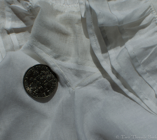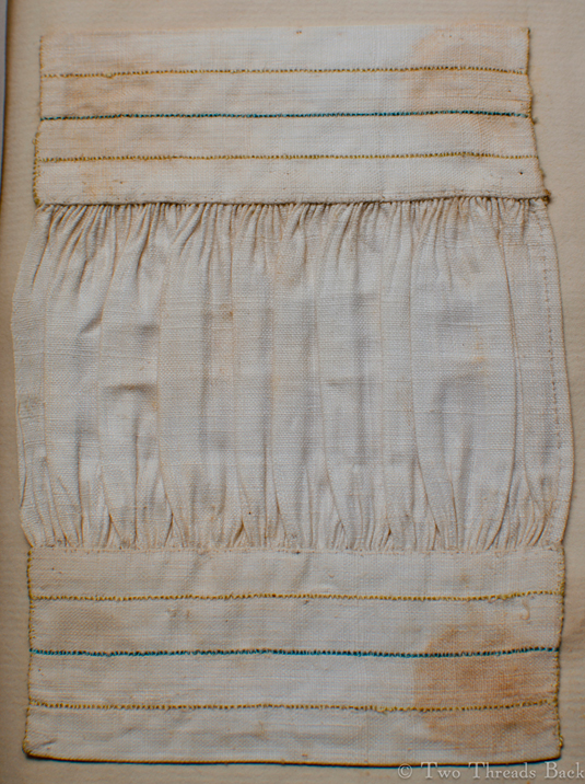 This method of inserting and fixing the sleeve in the band is also a clue when examining a garment to determine its age (or whether it’s a good reproduction!). I’ve noticed that almost all early pieces of plain sewing use this method for cuffs, collars, and waistbands, anything gathered and set into a band.