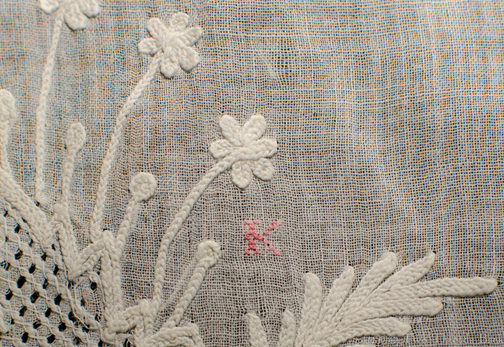 Gossamer-thin collar of cross-barred muslin with a sheer muslin frill.