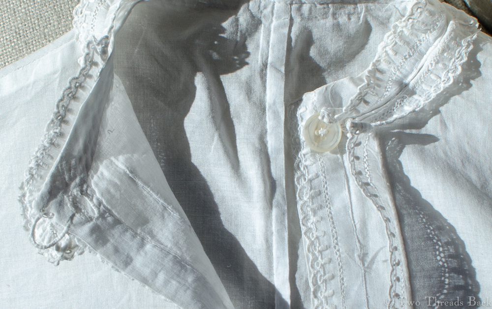 The sacque has a high collar with hand-embroidered trim and fastens with a single mother of pearl button and thread loop. There’s a buttonhole hiding under the trim on the collar, but Mother must have decided it was too tight or difficult to fasten. The same trim edges the front, hem, and cuffs. There’s even a bit of piping.