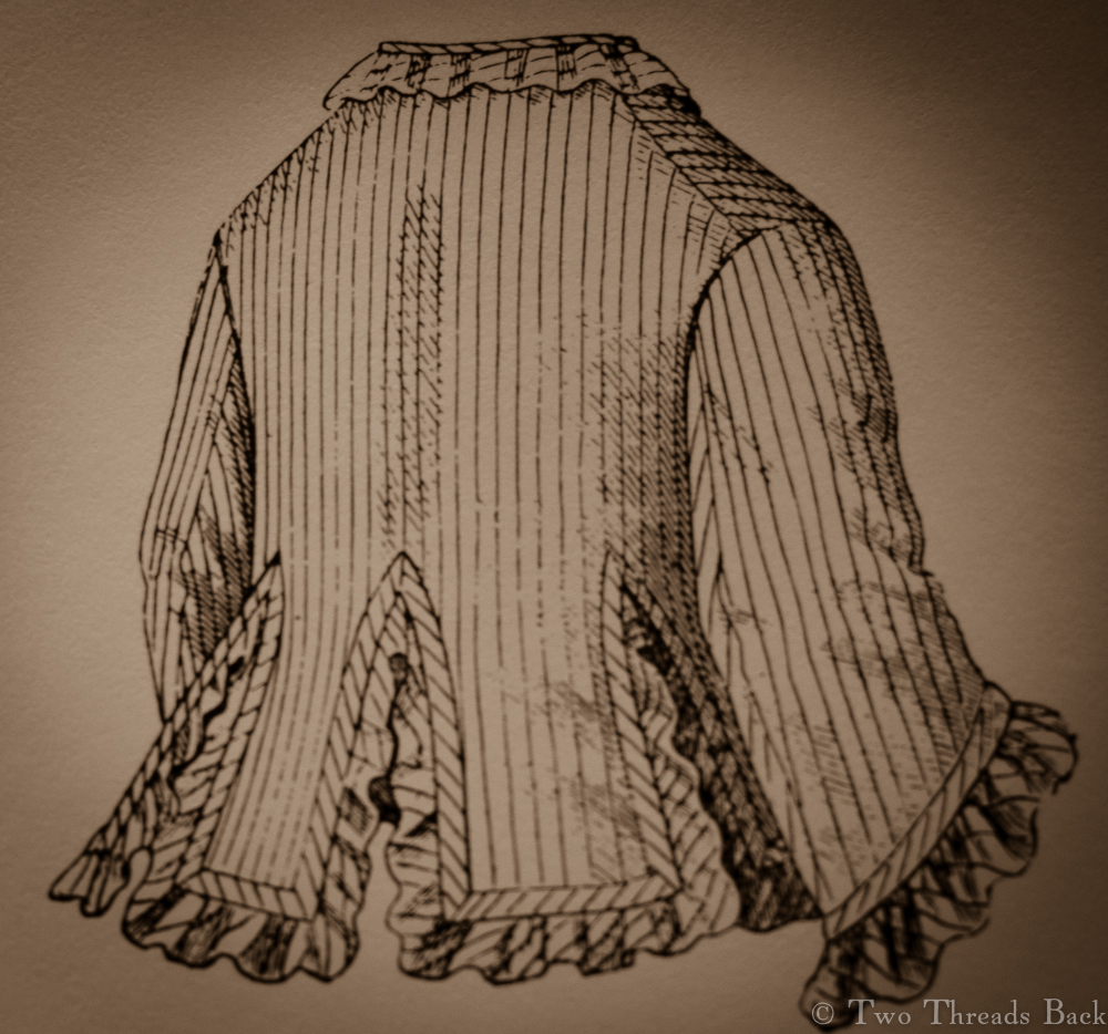 Here is one example which just seems to shout Baby Version of Mommy’s 1870 Upholstered Look! Notice the dropped shoulders, two-piece sleeves and sort of tabbed lower edge, with its allowance for a wee bustle? I doubt baby wore one, but the cut of the sacque would have suited it! The pattern is a match for women’s garments of the late 1860s and early 1870s.