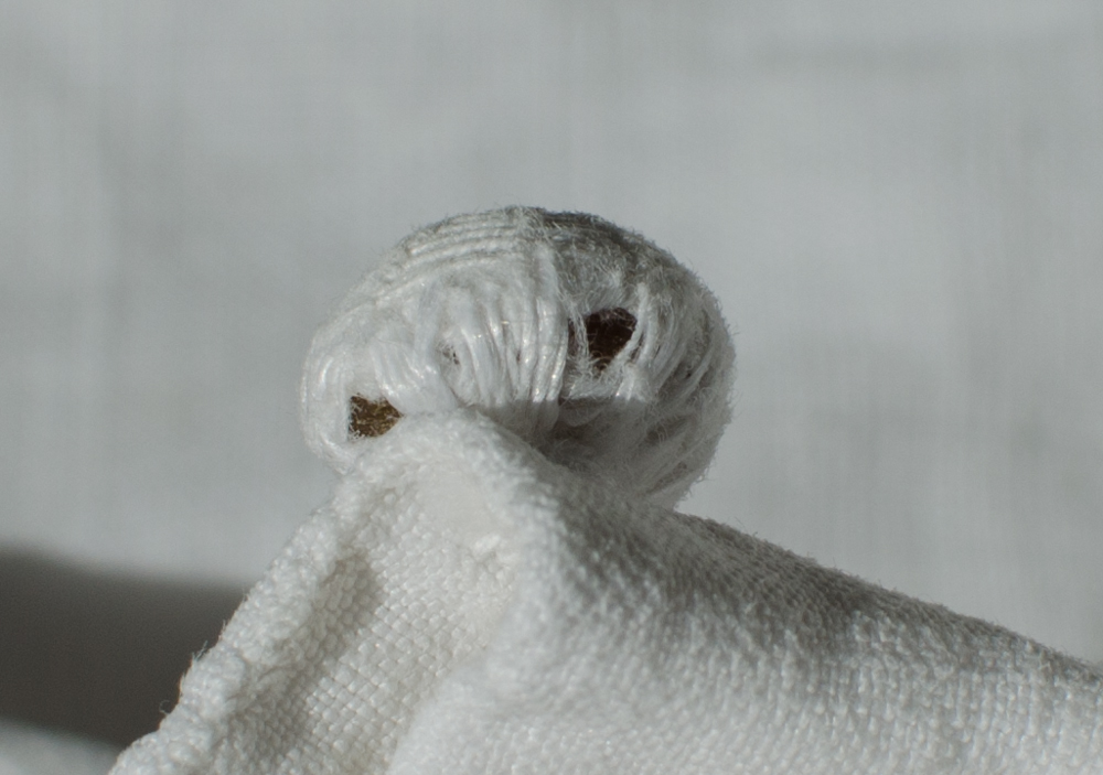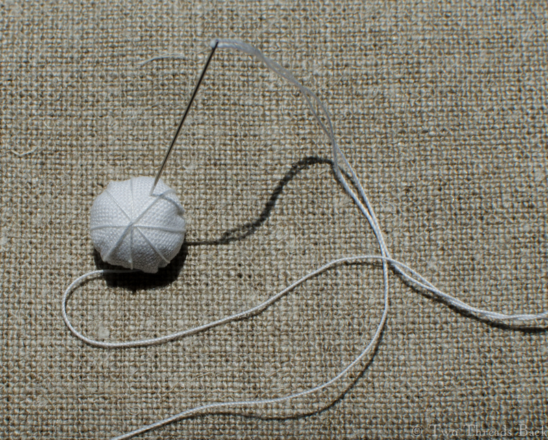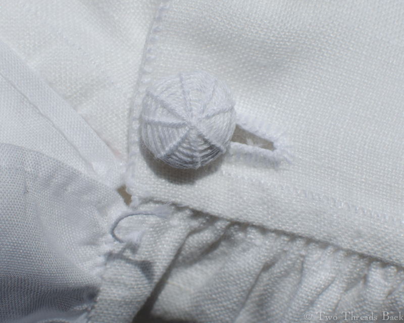 I didn’t have horn buttons, so I used shell instead, about 1 cm in diameter. I cut a little square of linen, about 3.5 cm, and on that I traced and cut out a circle larger than the button. The scraps served as stuffing for the knob. Waste not, want not.
