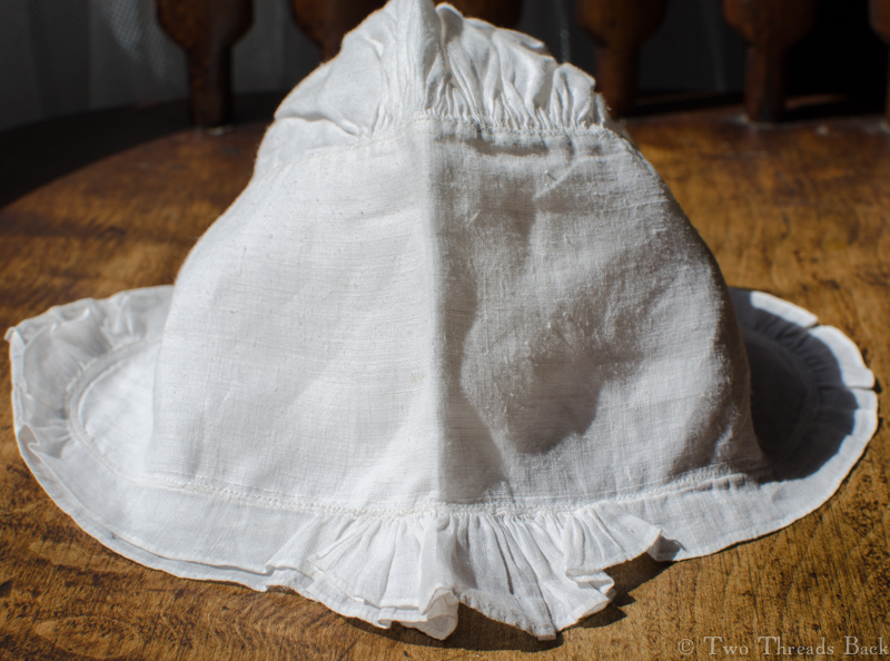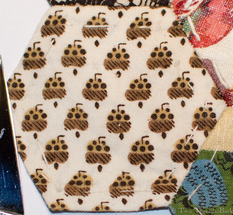 These patches are from an “English Paper Piecing” set. I believe it dates to the early 1800s, not only because of the patterns but because some of the paper that’s used on the back is c1808-1812. There are a few pages from English newspapers (London National Register, Monthly Magazine, etc.), private letters, and a whole lot of pages from an old copybook. Of course that doesn’t make a certain date; some fabrics could be earlier or later and it all could have been pieced later. But I’ll leave that to the experts.