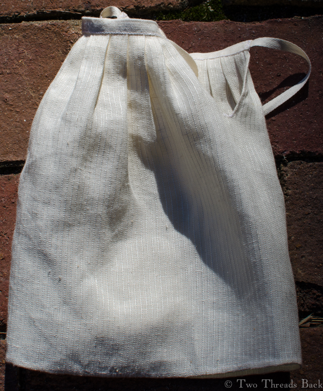 This little cap is a classic of 18th century style. It’s made of extremely fine linen (I know it looks coarse in the photos but it’s really not) with a double brim and a narrow linen tape to draw it up to fit at the neckline. There are no ties to fasten it under the chin, nor signs that there ever were.