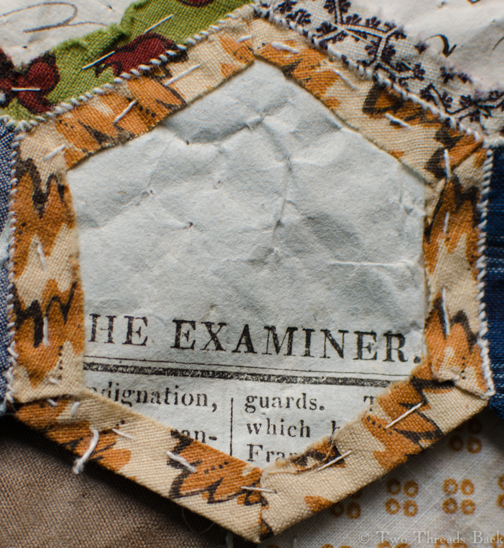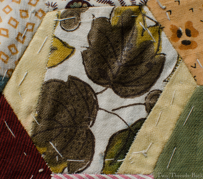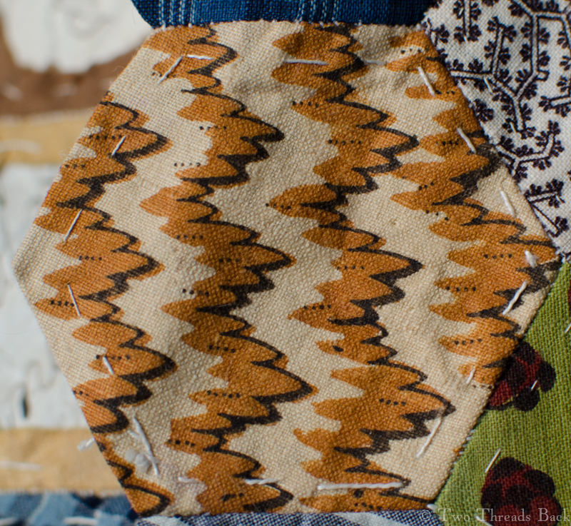 The maker was certainly wanting to use it though, because she had to piece the piece. You can see just how tiny the scraps were, and it amazes me that she made the effort. Keep in mind the whole hexagon is only 2 inches across!