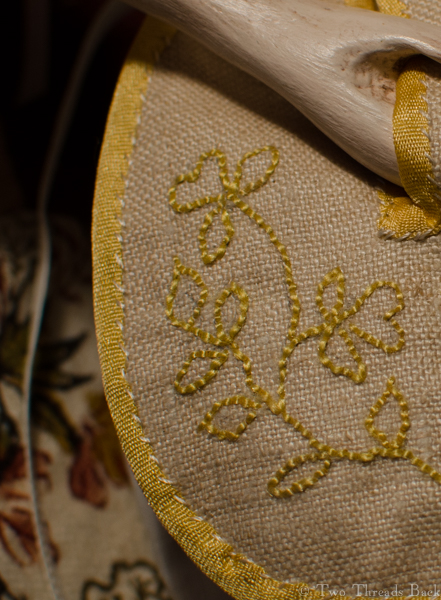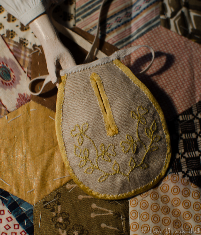 There are so many images available online that it was hard to choose a model for her pocket. I finally settled on “the look” of a sweet little doll version in the online Pockets collection at the VAD. (Click the link and then search for “doll´s pocket Nottingham.”) It resembled a couple of others, also worked in yellow thread, that were made for women rather than dolls. And it only required a backstitch!