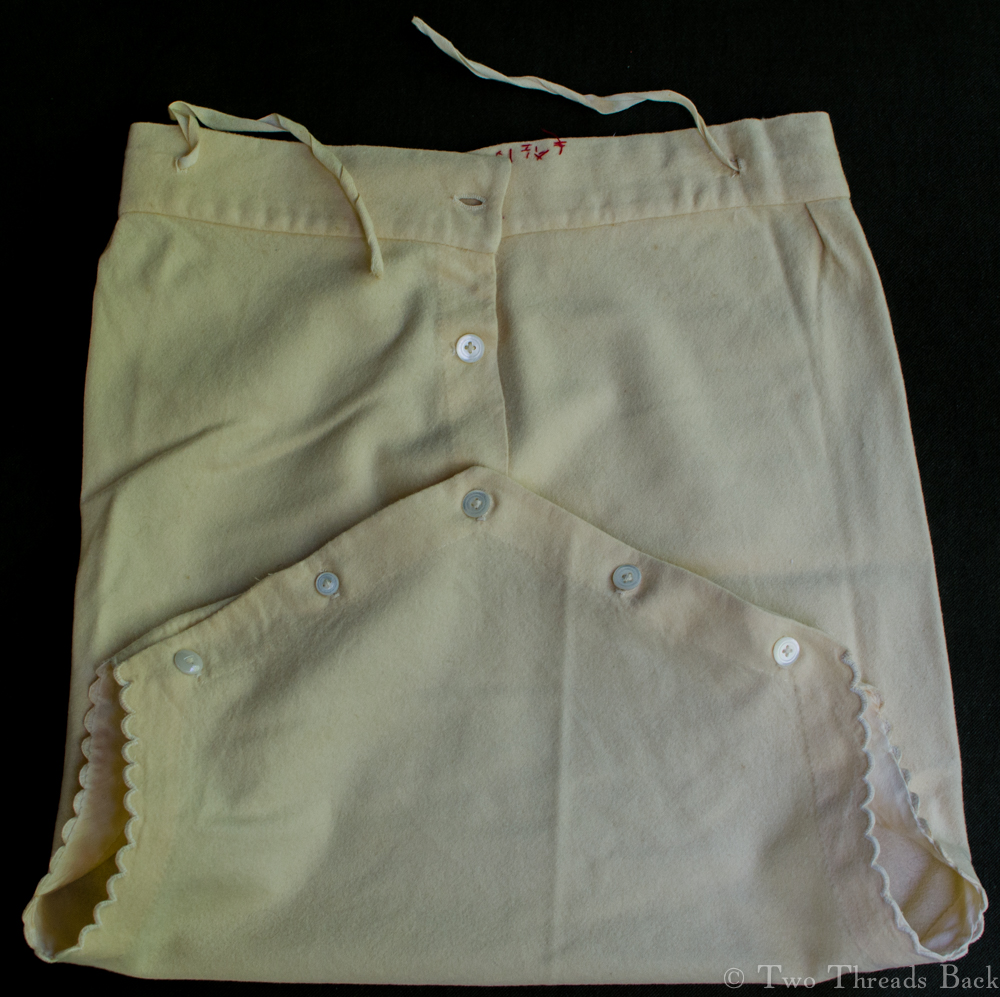 In the days before modern heating, wool flannel was often part of a baby’s wardrobe. Although warm, it seems like wool would be awfully heavy and itchy if worn close to the skin. Maybe that’s just my modern-day sensibilities? But at least the wearer of this diaper enjoyed the relative comfort of buttons for fastening, rather than pins. And I don’t mean safety pins! Babies in earlier times weren’t always as fortunate as the owner of this diaper. Advice books often warned against pins and the possibility of terrible consequences when they pinned the baby instead of the clothing! William Buchan, writing in 1808: