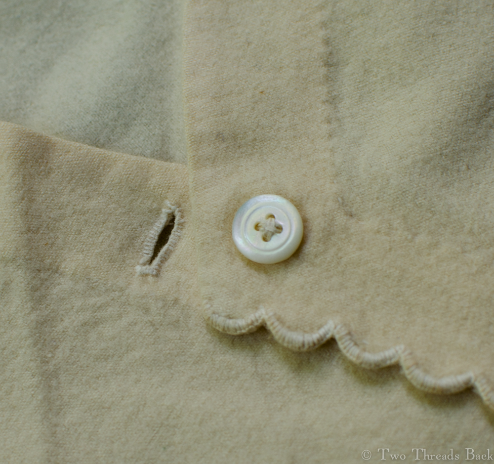 Instead of the herringbone stitch, this has been bound with a cotton facing and trimmed with a blanket stitch in neat scallops. Herringboning, the stitch recommended in period manuals for anchoring seams on heavy material, wouldn’t have been sufficient to secure the edges, considering the laundering required.