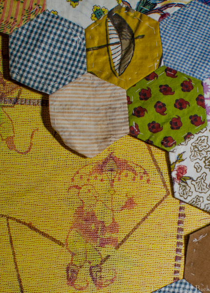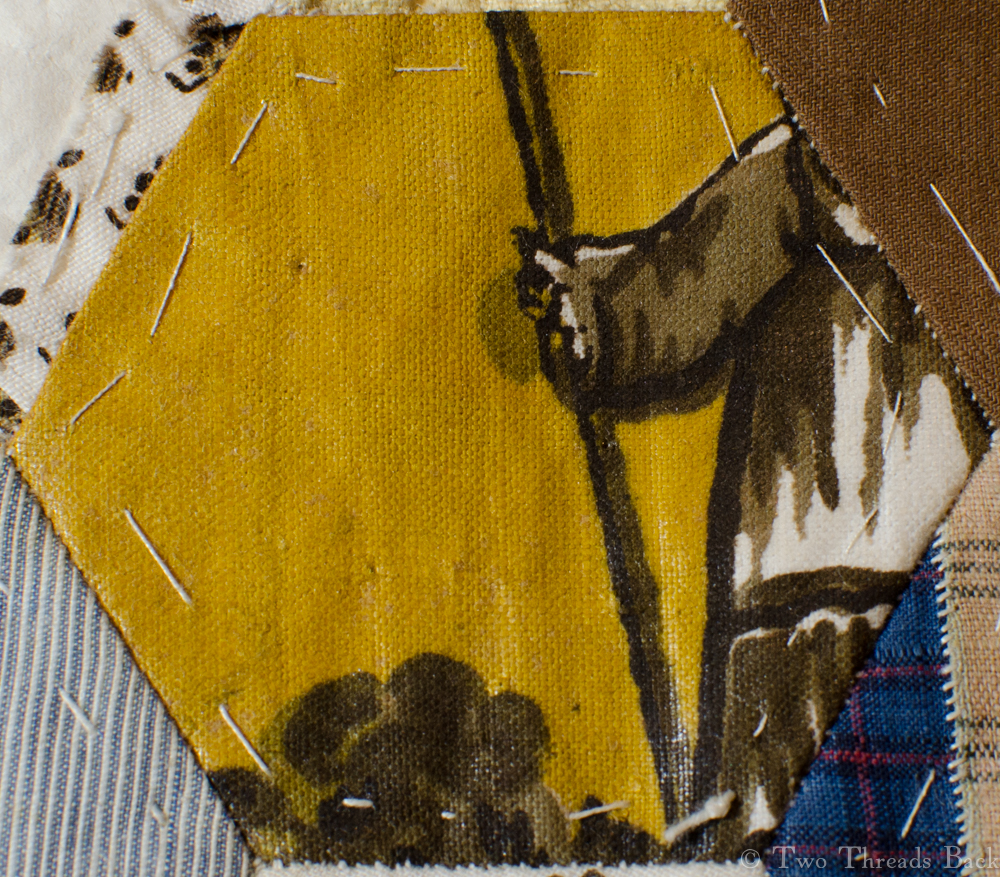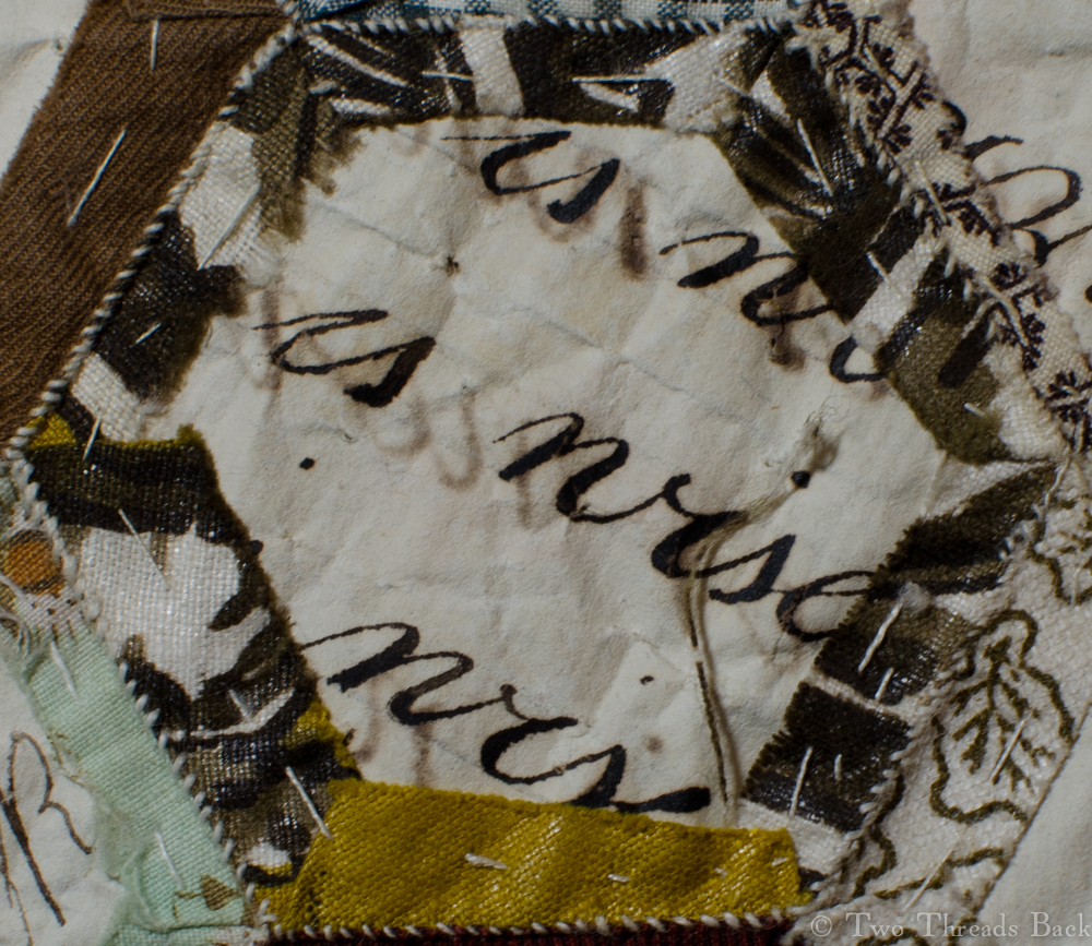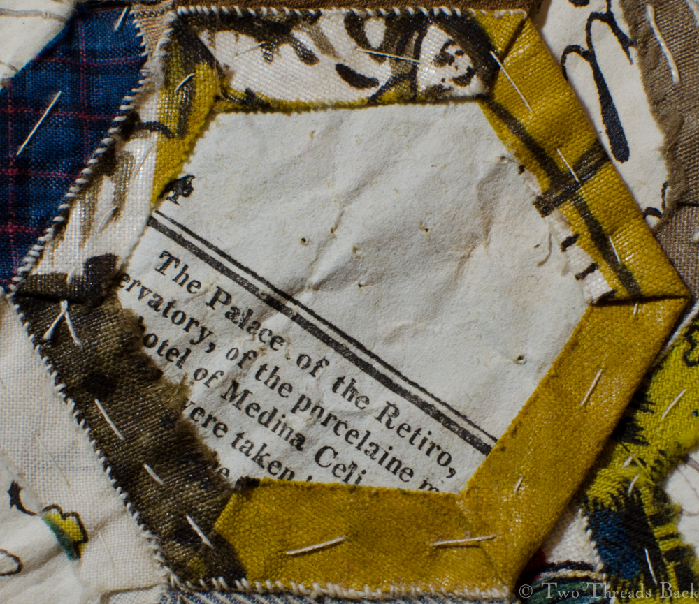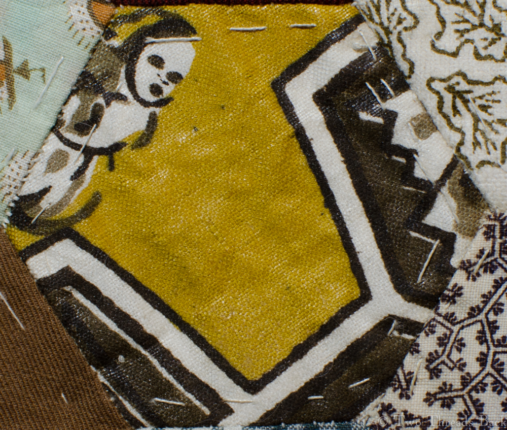 Finally, I found this illustration from Fashioning Fashion: European Dress in Detail, 1700-1915, by Sharon Sadako Takeda. (Fabulous book!) It’s definitely yellow. And the pattern is certainly exotic. The quilt fabric, however, is heavily glazed, and I have no idea whether it was used for apparel or furnishings. I re-read the section on yellow dyes in Susan Greene’s Wearable Prints hoping to identify the type, but decided I’m too inexperienced for that.