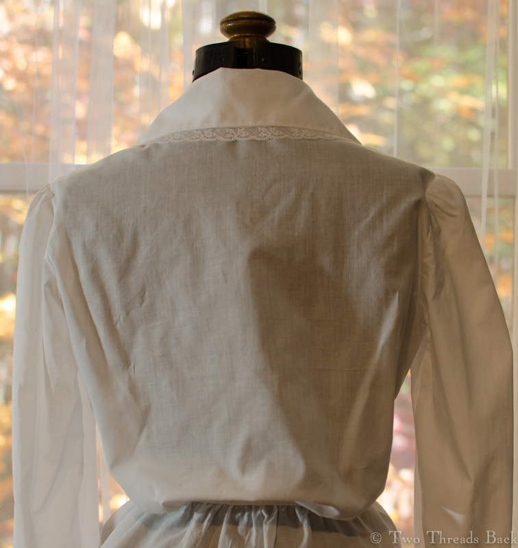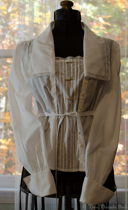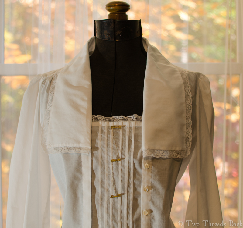The fit was nice, the collar lay smoothly, and the tucked front went together easily. The cuffs were the only disappointment. I didn’t like the way they looked when buttoned and turned back, because there was no allowance for the overlap in the pattern. Removing the lace trim helped, but if I ever make another one, I’ll have to fiddle with the cuffs.