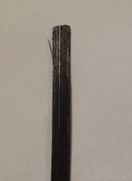 It’s been a while since I added anything to Pharaby’s wardrobe, and with heaps of projects competing for my time I decided to tackle the quickest thing: a busk for her stays. Perhaps that might keep her happy until I have a little more leisure? I figured I could take a damaged “bone” from my stash, trim it to fit, and etch her initial. No problem.