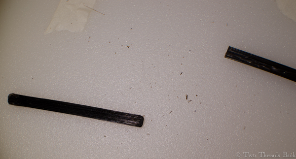 The doll stays, pocket sewn in the lining, awaiting a 2-inch long busk.The aged and injured piece of baleen I started with, shredding on one side and blistered on the other.Now it’s taped in place on the cutting board for a quick trim. Not! After sawing and sawing for a while, it was time for Plan B.Plan B: I recalled a period domestic guide advising that boning should be soaked in hot water. Here we have baleen soaking. Soaking is not enough.Or was that boiling water? Here we have baleen soaking in boiling water. It sufficed, barely.Success at last! And for the final touch, a little filing to smooth the edges. What, no etching of her initial? A verse, a heart? After a little discussion, we decided to wait until her sailor sweetheart returns from the sea and let him do it. The busk will keep her stays put for now.