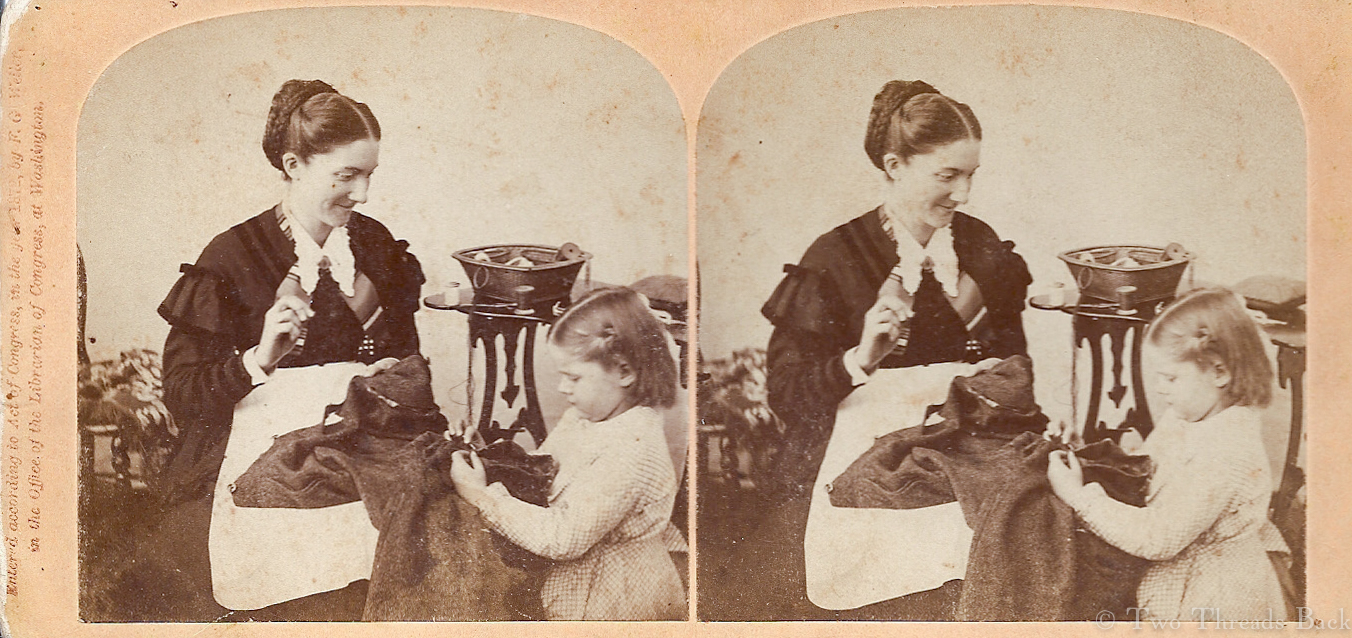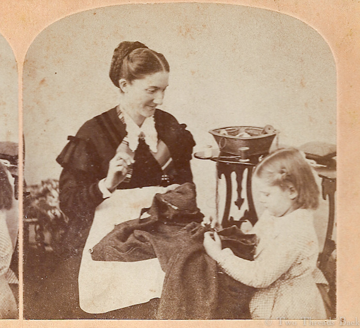 It’s time to jump forward a hundred years from the subject of my last post. Here’s a peek at a pleasing, albeit staged, scene of domestic happiness. I love these old stereoviews because the photographers often took such pains with the props, trying to tell a story. And if the subject is sewing or 19th century domestic life, that makes me very happy!