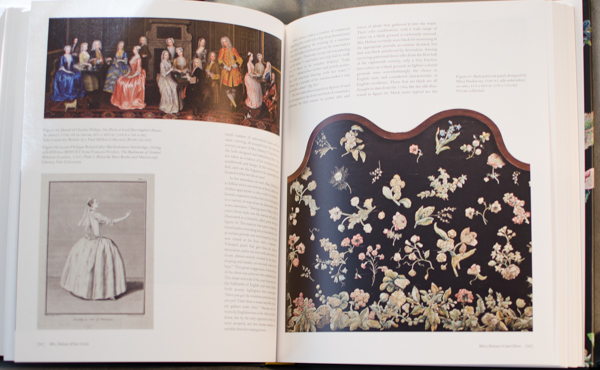 Oh, did I mention The Dress? Mary Delany lavished her black satin court dress with the most exquisite, scrumptious, dazzlingly beautiful floral embroidery I’ve ever seen. There’s a whole essay devoted to it. Other illustrations include workboxes, tools, patterns, fashion plates, cartoons, etchings, prints, shells and shell art…. In all, enough to keep me fascinated for a long time.