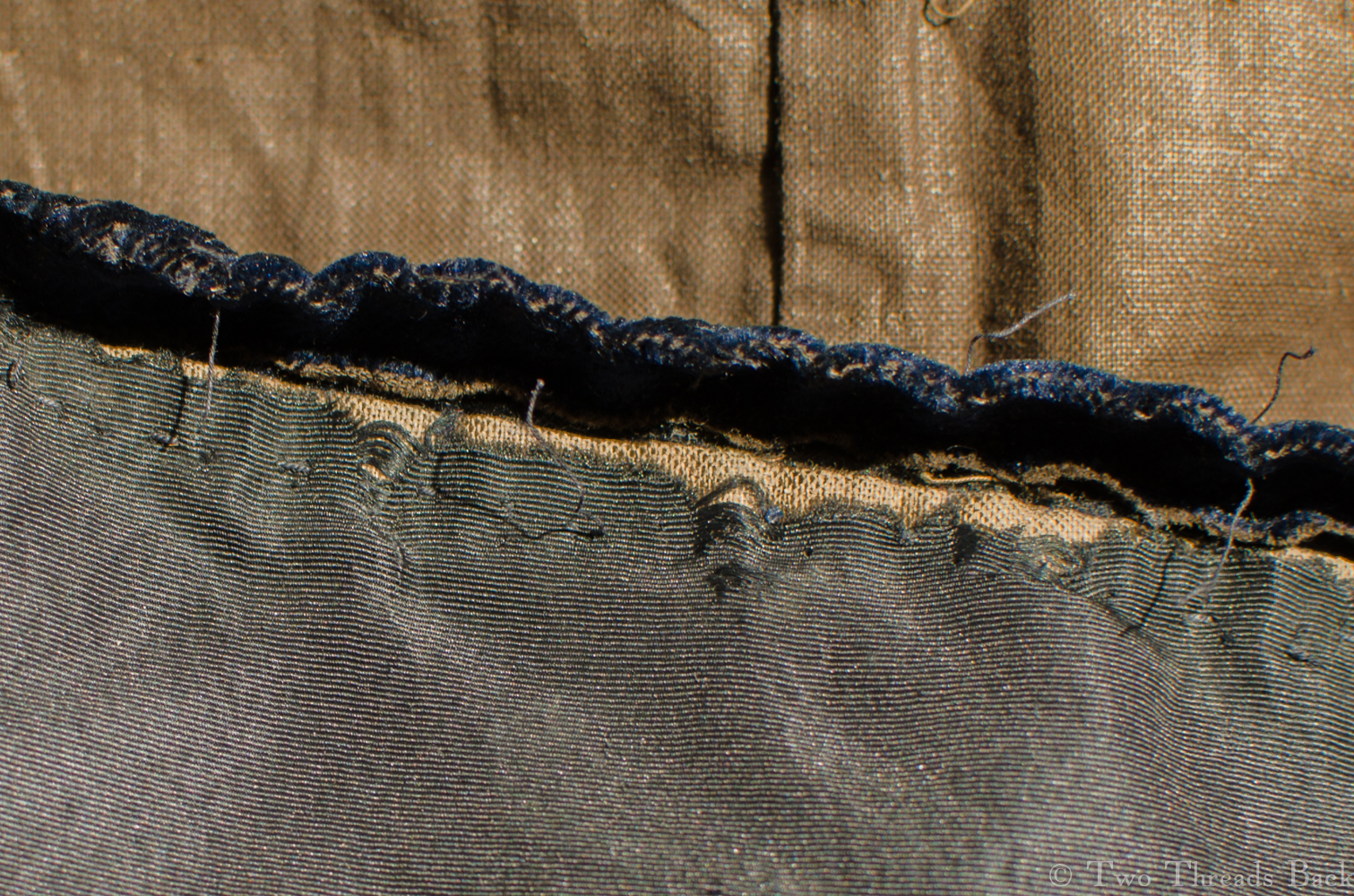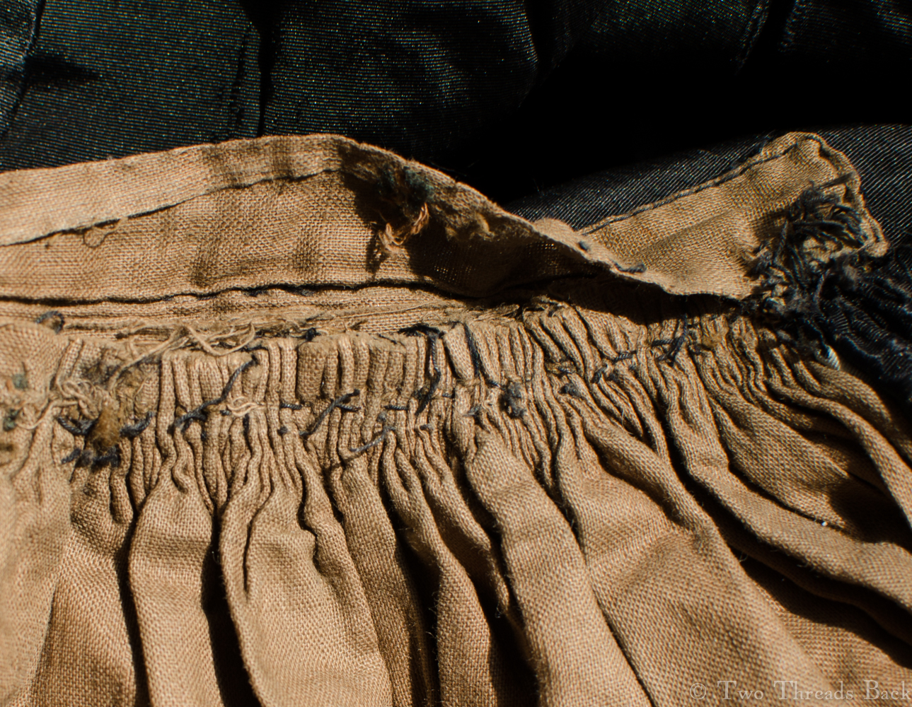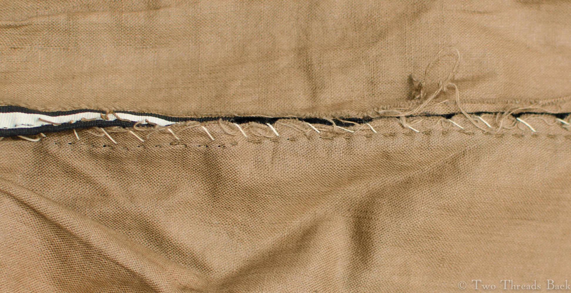 My attempt at narrow hems was a flop, at least compared to what 18th century women could do. But I did manage a very nice tiny eyelet for the back drawstring. It would have been nicer if I’d also remembered to put in the strings and tack them in place before I hemmed the casing down! Did you know that you can thread a large needle and retro-fit a string into a casing?