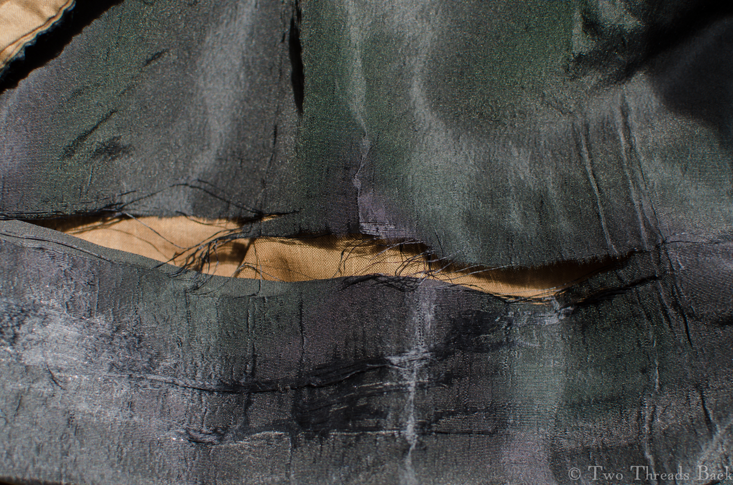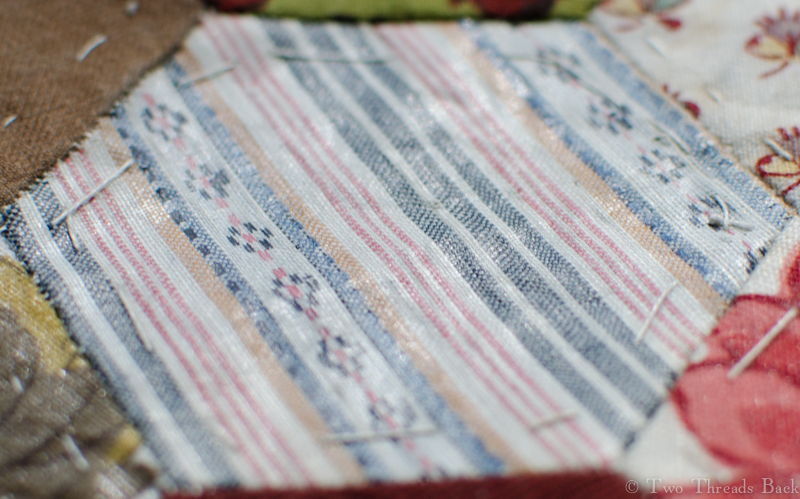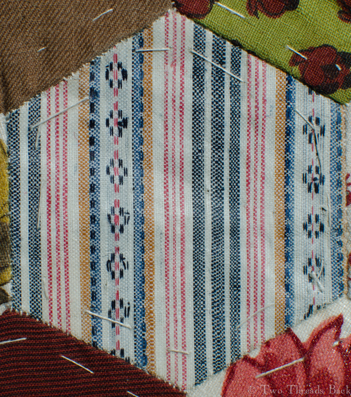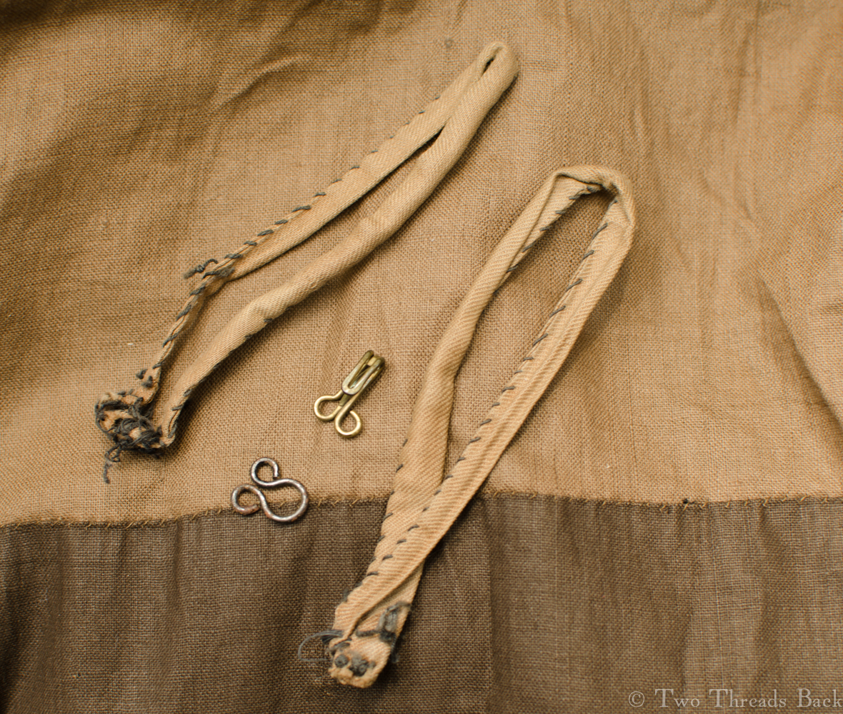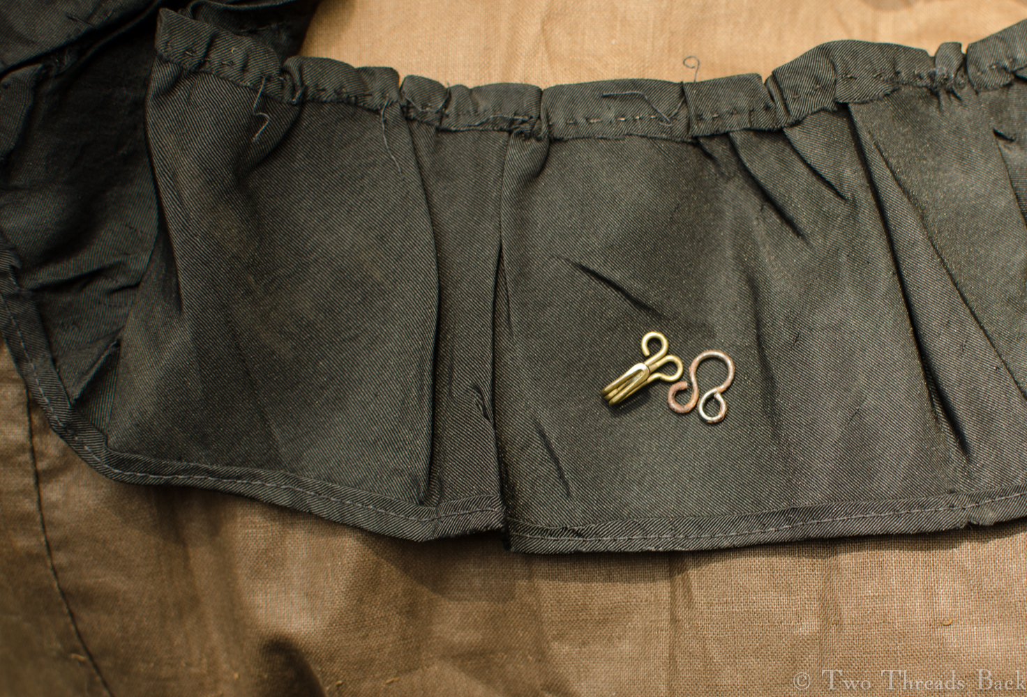 My attempt at narrow hems was a flop, at least compared to what 18th century women could do. But I did manage a very nice tiny eyelet for the back drawstring. It would have been nicer if I’d also remembered to put in the strings and tack them in place before I hemmed the casing down! Did you know that you can thread a large needle and retro-fit a string into a casing?
