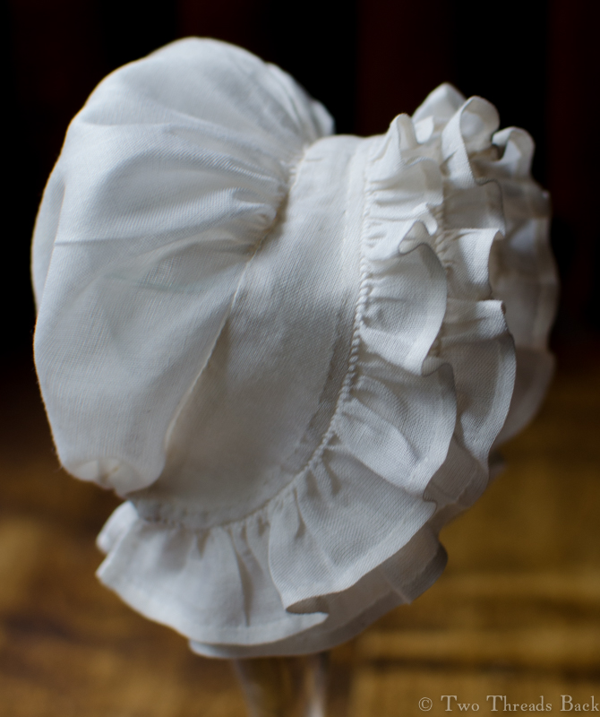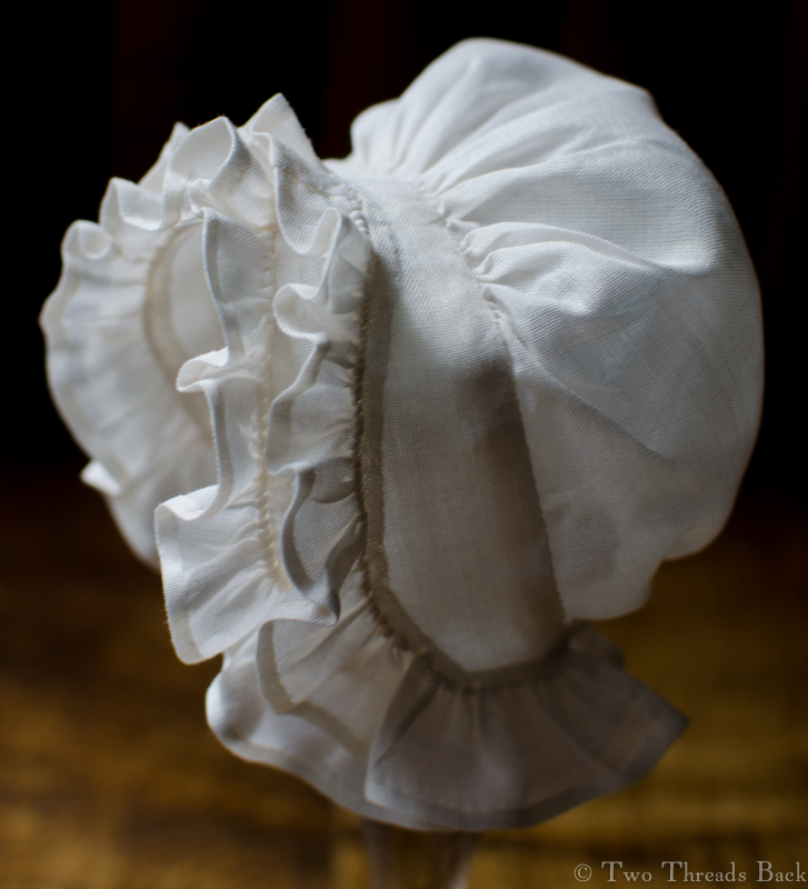 In the end I decided on this style, because it was easy to make a pattern and I’m familiar with the sewing techniques. The cap is formed from a simple half circle gathered at the base of the neck and the crown and trimmed with plain frills.
