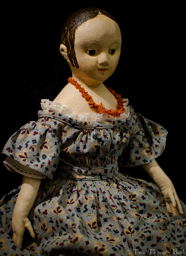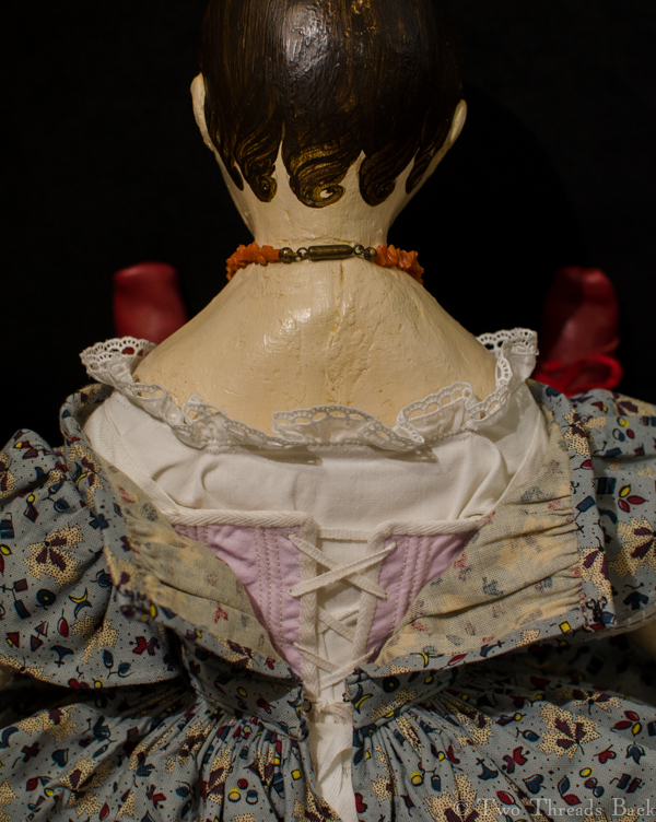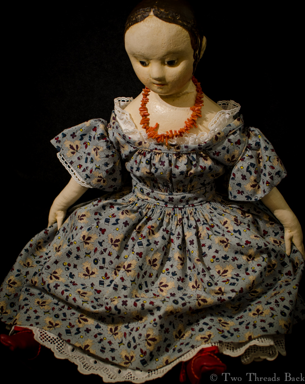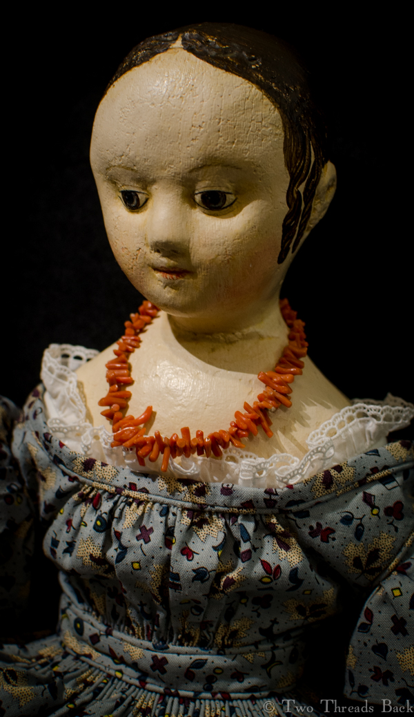 If you spend any time looking at 19th century portraits and daguerreotypes of children, you’ll notice that many (most?) girls wore coral necklaces. I was delighted to find a bargain to finish her ensemble. It was sold as a doll necklace but looks suspiciously like a bracelet. No matter. The graduated coral pieces make it look enough like a necklace to suit us just fine.