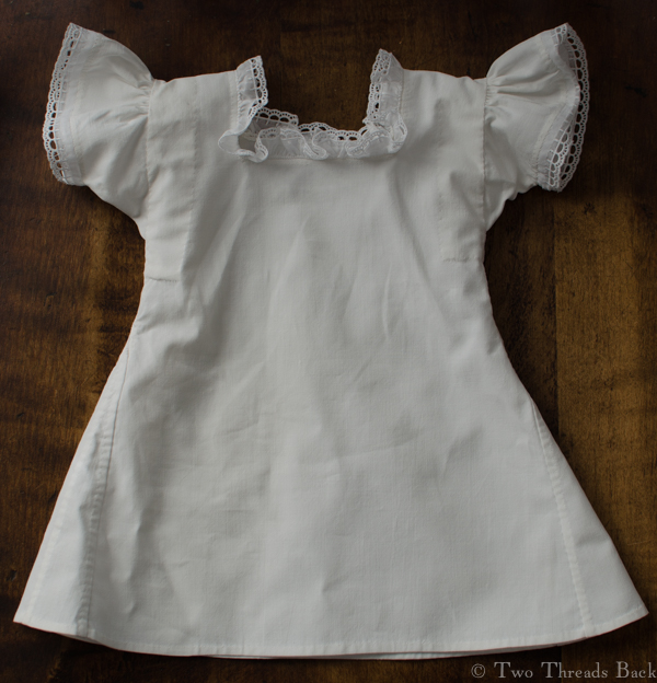 The chemise came first, and I tried to make it with the same details that a real mid-19th century young lady’s might have had: gussets, gores, and binders. I know, unless you’re used to period costume terms, they sound like instruments of torture. I guess they were, actually, for me! It would have been a lot easier to make a simple doll chemise, and from now on any others will be quite plain. They’ll have to be; this one is so bulky that a dress has to be specially cut to fit over it. Live and learn.