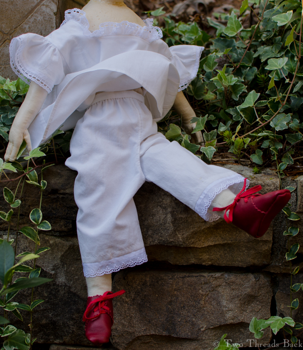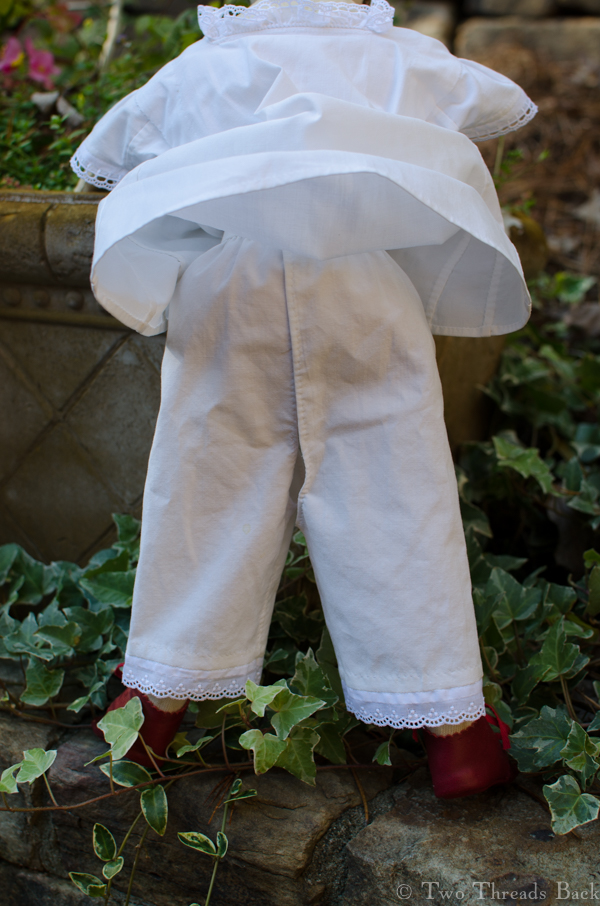 Next came the drawers. Since Jessamine is an older girl, I decided she would have split rather than closed ones. Well, really I just wanted to make them that way. Of course that means it’s trickier for her to pose with them while retaining her modesty. But we managed. I suppose you can tell from the photo that this wasn’t taken in December? And surprise – it wasn’t this year, either!