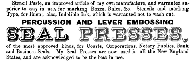 Indelible ink, cloth stretchers, and marking pencils weren’t the only advances on cross-stitch. Stencils were available from stationers or engravers, and could be had by mail order. Mr. Congdon of Worcester, Massachusetts offered such aids, as seen in his ad from 1856: