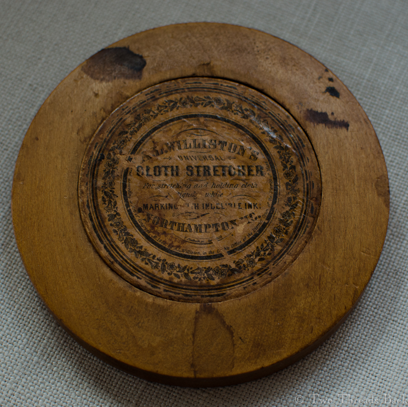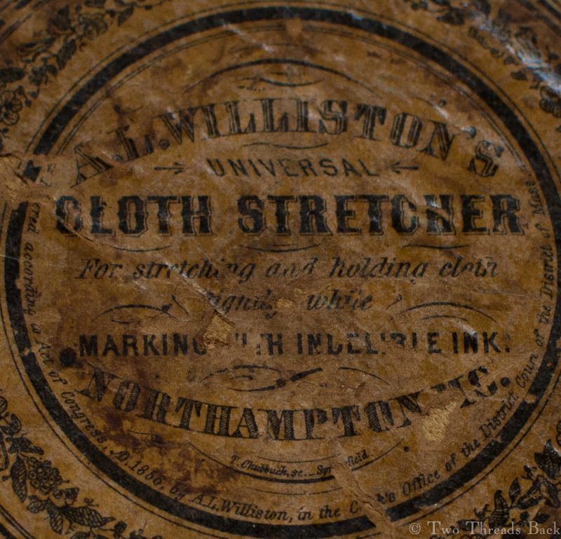 But wait! As we move from marking with needle and thread to marking with pen and ink, we’re moving into the decades of innovation: those glorious years celebrated by Great Exhibitions and more new patents than you could shake a stick at. Wouldn’t it be nice to have your cloth held taut while you wrote? A cloth stretcher could handle that.