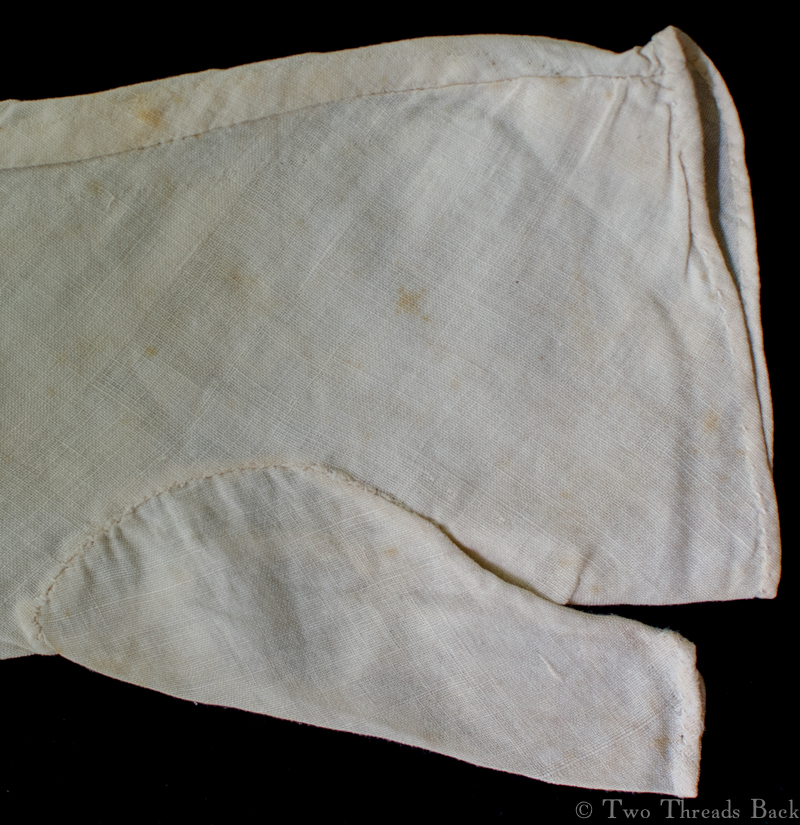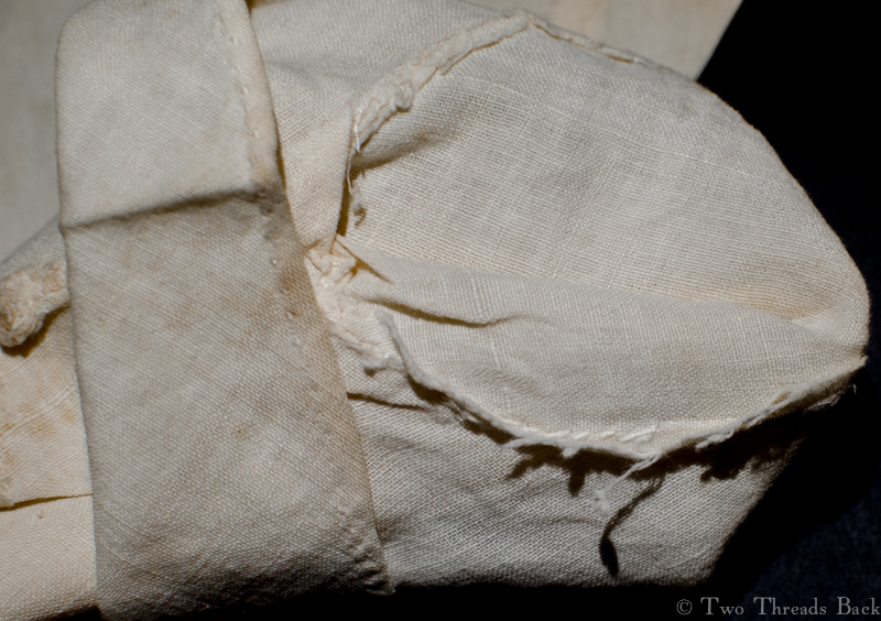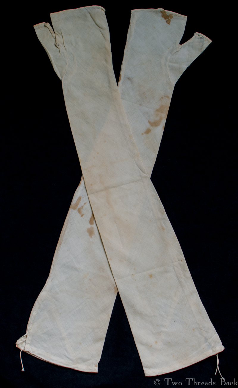 These mitts caught my eye because they are so different from the 18th century linen and silk embroidered beauties that I’ve seen in books and museums. Having never seen anything like them before, I was intrigued by their plain sewing simplicity. Time to look for clues. Ready, Watson?