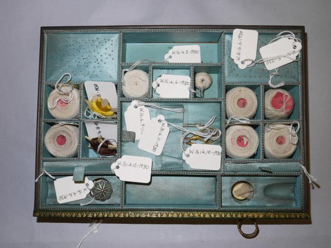 But the last is an image, c.1810-1815. From the V&A, it’s the picture I’d always hoped to find: a thread-stocked workbox. The little “tickets” are pink, with the thread size stamped on them.