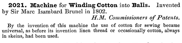 His biography informs us that, “A machine for twisting cotton-thread and forming it into balls was also amongst the earliest of Brunel’s inventions in this country. The impulse given by this machine to the employment of cotton can now scarcely be credited. The little balls were very elegant in form; and from the manner in which the thread was wound, they presented the appearance of net-work, or ribbons of lace. The Machine measured the length of the thread which it wound, and proportioned the size of the ball to its weight and fineness.”