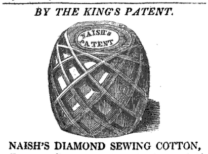 If the illustration below is an example, I do think they’re lovely! Illustrated ads for sewing cotton wound in a fancier lattice design appeared in periodicals from 1819 to 1827. Here’s one from La Belle Assemblée, 1819. The inventor was Edmund Naish, Quaker, who patented his method in 1818.