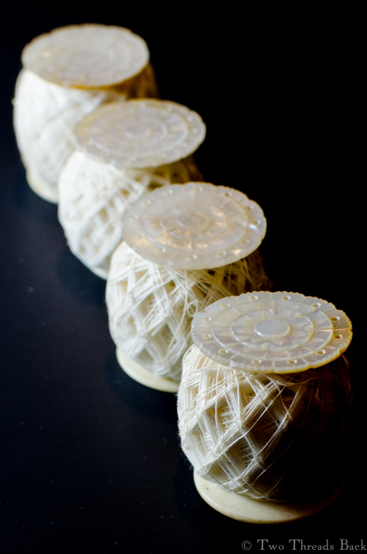 Period merchant accounts mentioned skeins, weights, and quantities of sewing thread, but that didn’t tell me what I wanted to know. What would the thread actually look like when Some Lady brought it home from shopping or stuffed it in her workbag at the end of the day? (No, don’t say tangled!) After years of drooling over images of antique sewing boxes, you’d think I’d have spotted quite a few that still had the undoubtedly original working thread stashed inside. But I didn’t. A little more fruitless searching, and I decided to shelve the question.