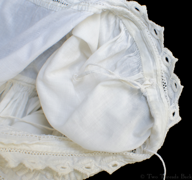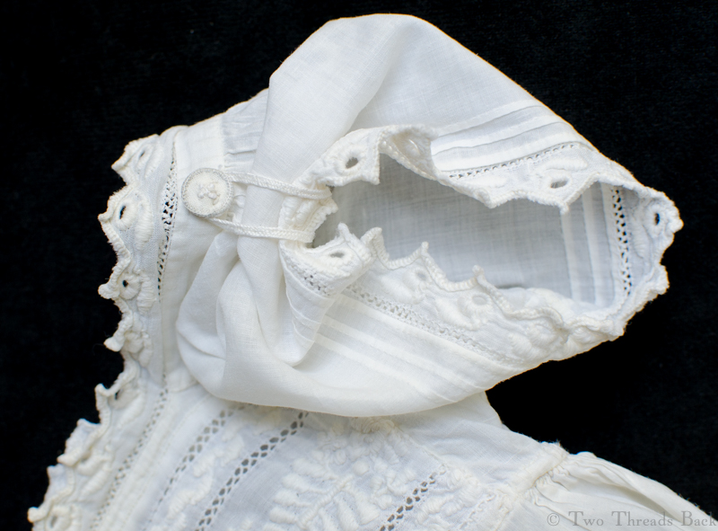 You can just see the pretty – and simple! – stitches along the hem of the sleeve and the neckline. A variation of this is fairly common on later baby gowns, used along the waistband.