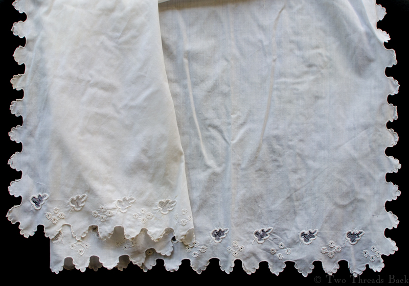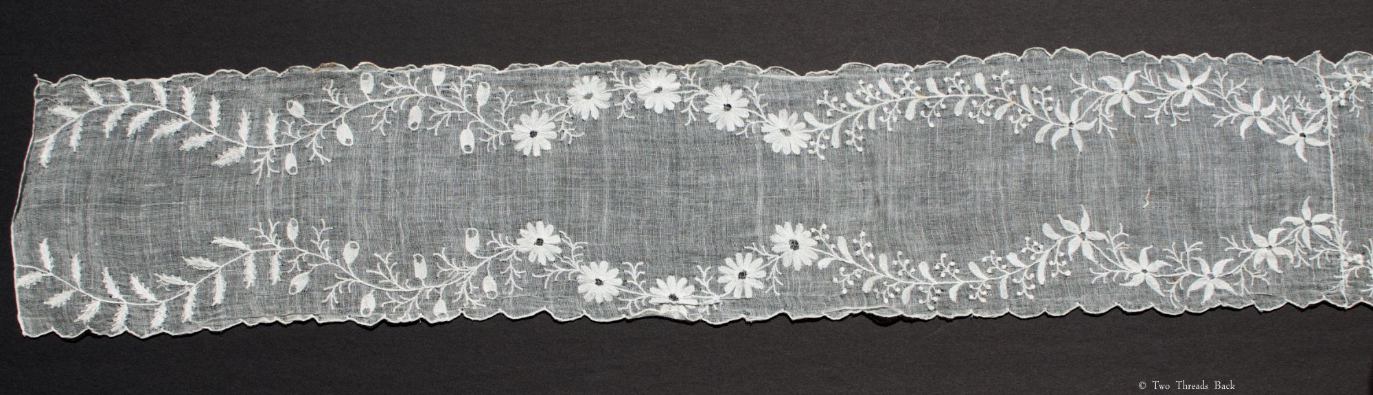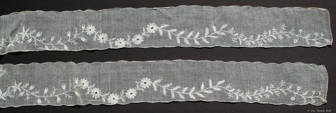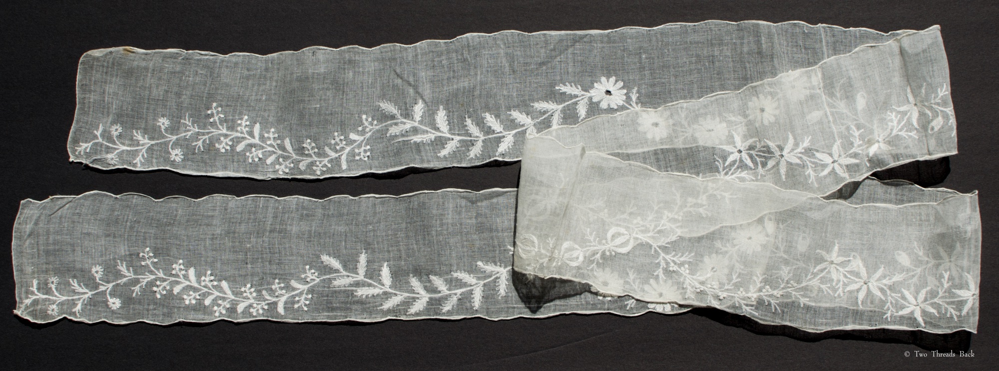 But what have I got here? Two different long strips of fine white muslin, neatly (but probably not professionally) embroidered with whitework. Are they one-piece lappets, or something else?