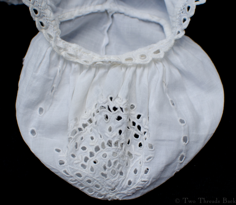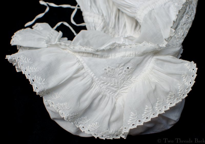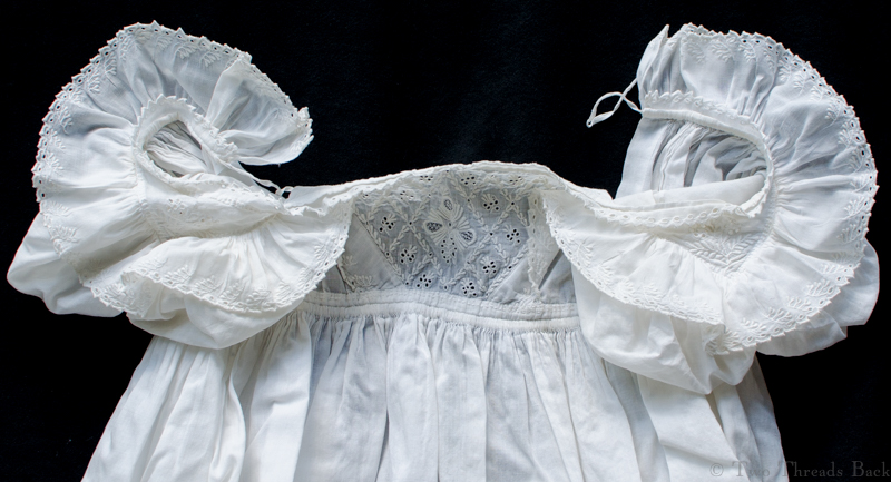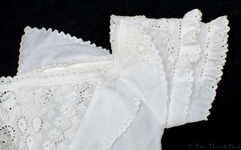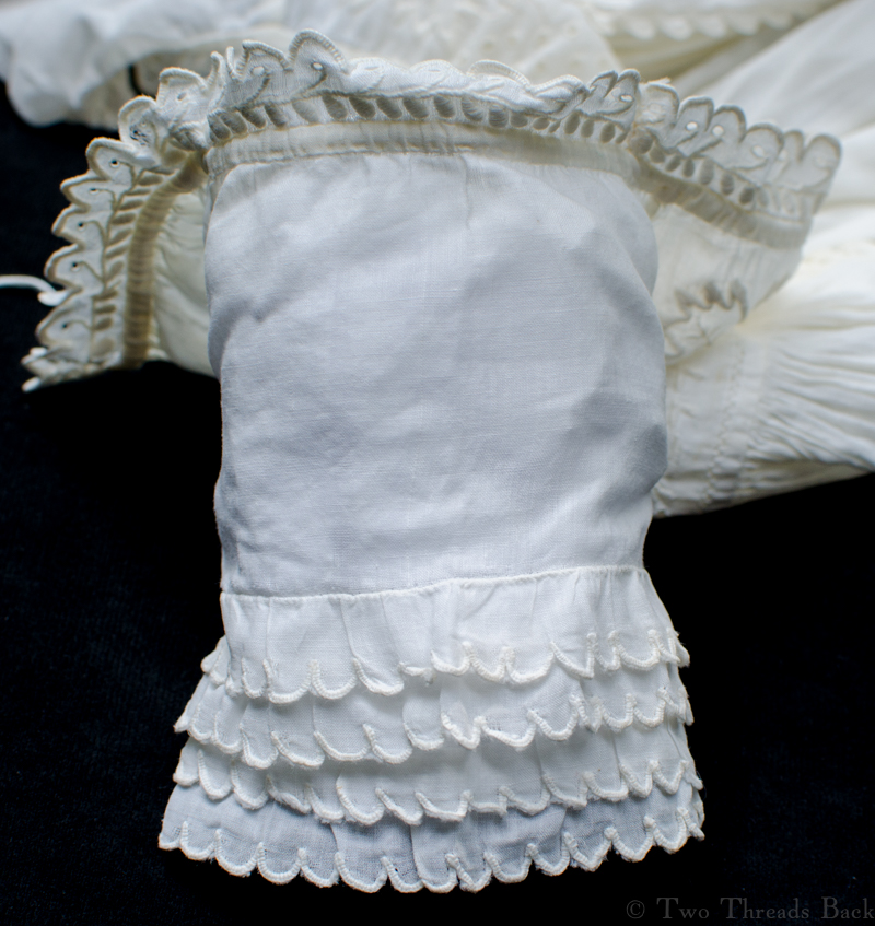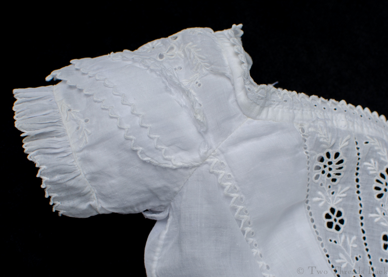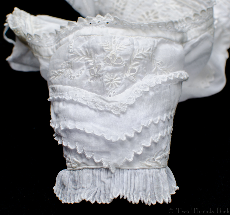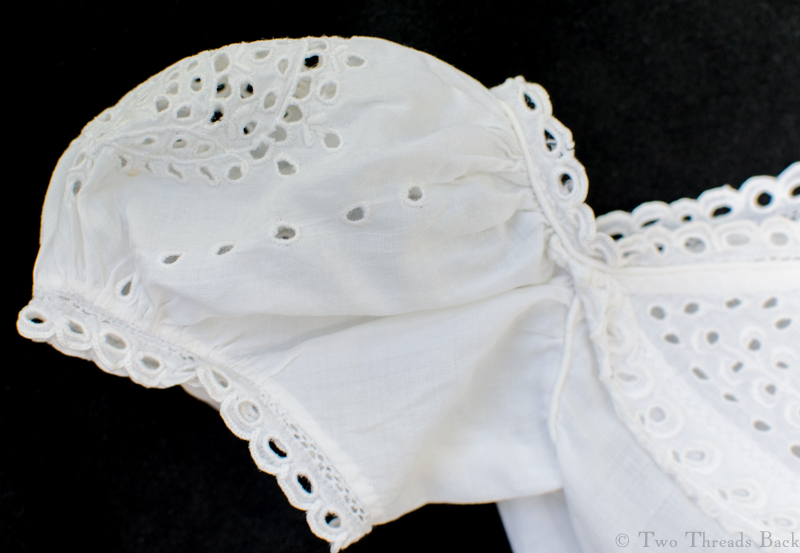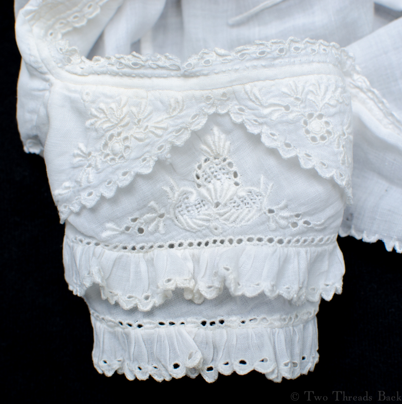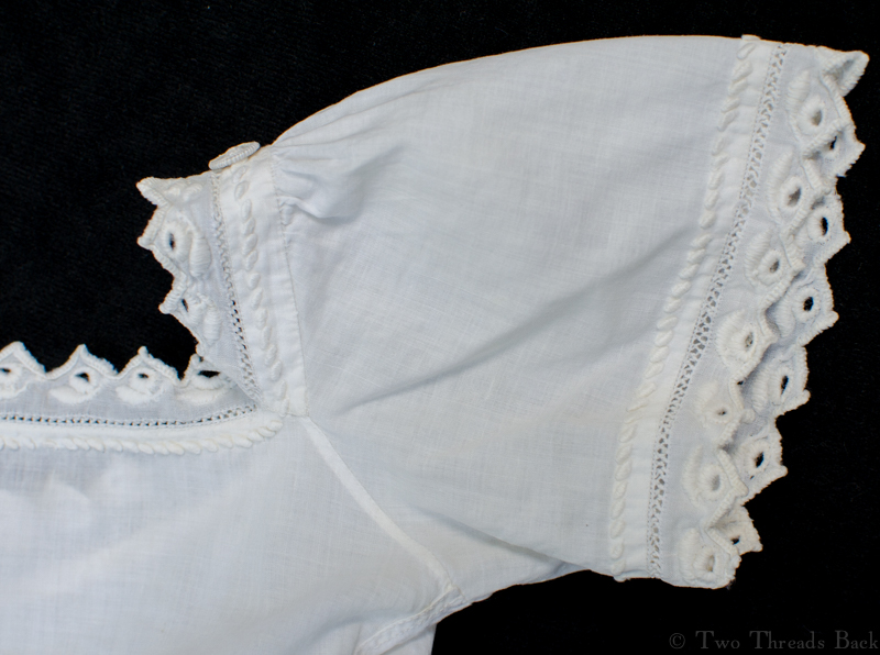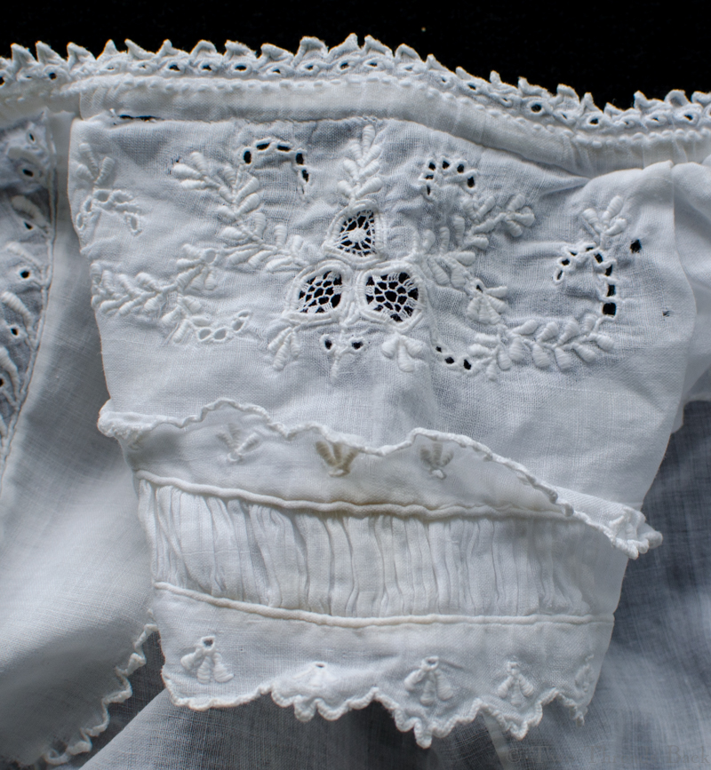And now the last sleeve offering. It’s a pretty Ayrshire gown, made before they began to get a little coarser and machine sewn. Well, of course some baby gowns have always been hand sewn, but from the 1860s there were a lot more machine-made.