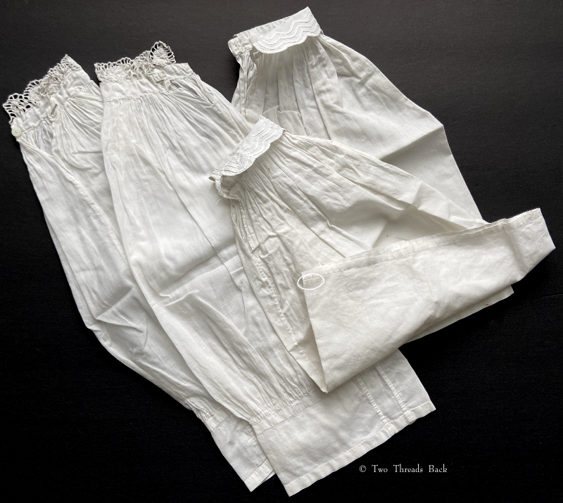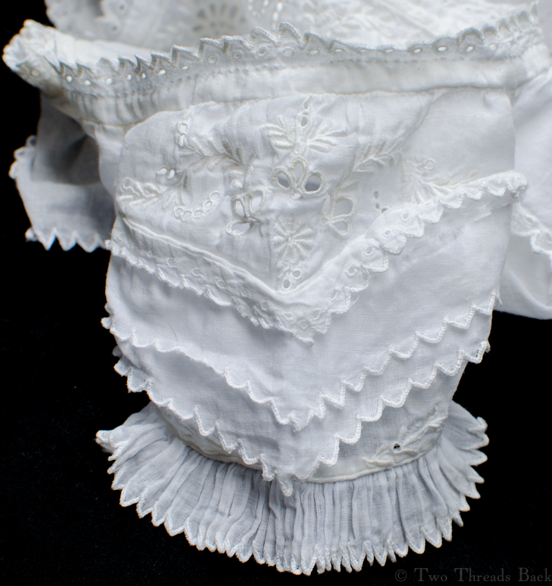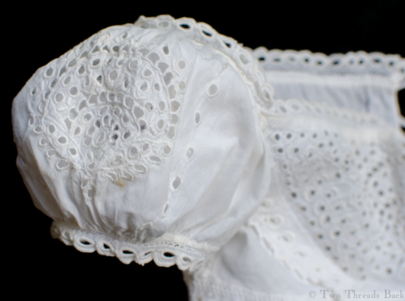 I thought a sampling of sleeve patterns from infants’ gowns would be fun to compare. They tended to reflect current styles in women’s fashions, but perhaps you’ll notice that, even with a palette of white fabric, white lace, and white thread embroidery, the artists must have been losing some serious sleep.