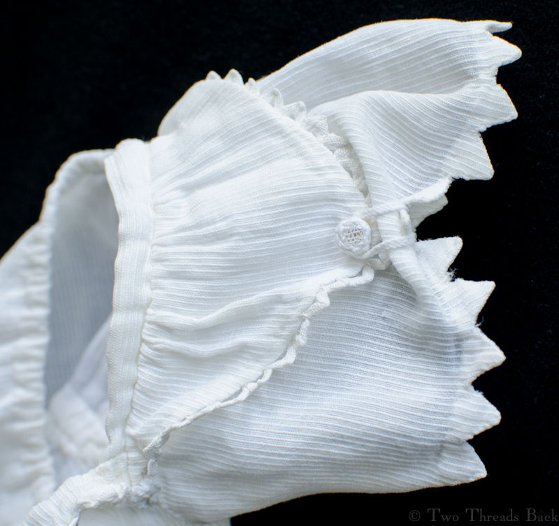 A view of the back of the vandyke, or pointed, edging on the petticoat. This trim, like the petticoat itself, was done completely by hand and not finished with a line of machine stitching.