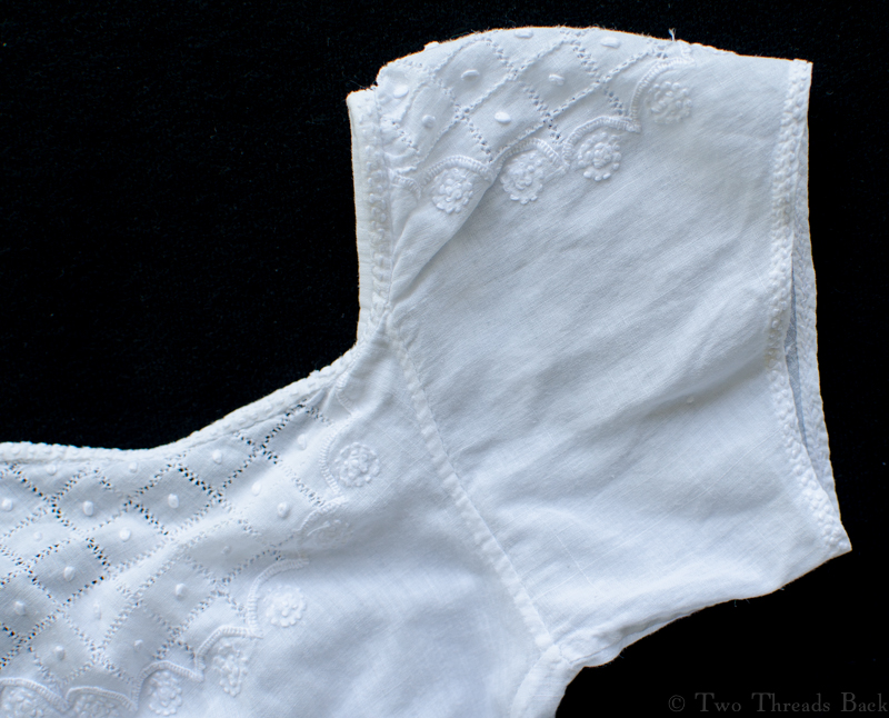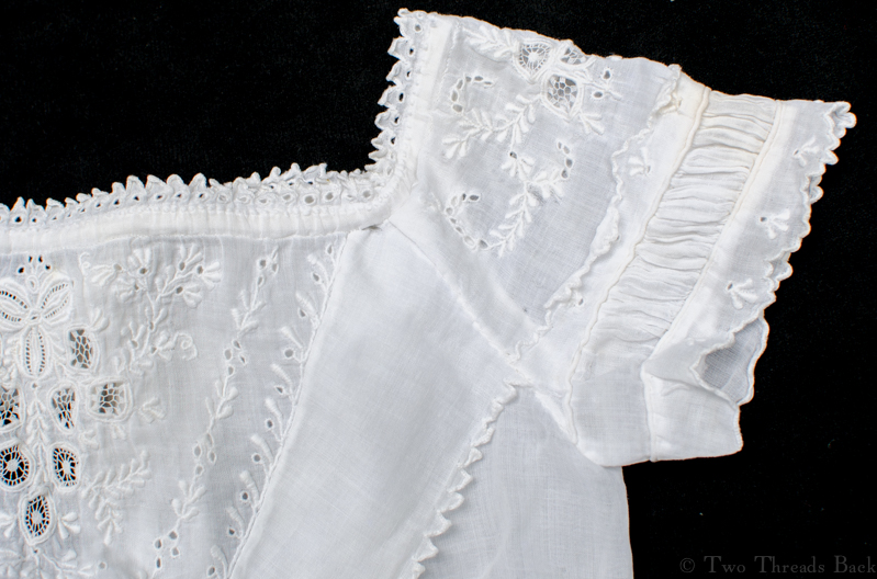 Now for some broderie anglaise! I know it didn’t reach the height of popularity until later, but something about this gown seems to suggest late 20s, early 30s. The sleeves just want to stretch out in that wiiiiide horizontal fashion.