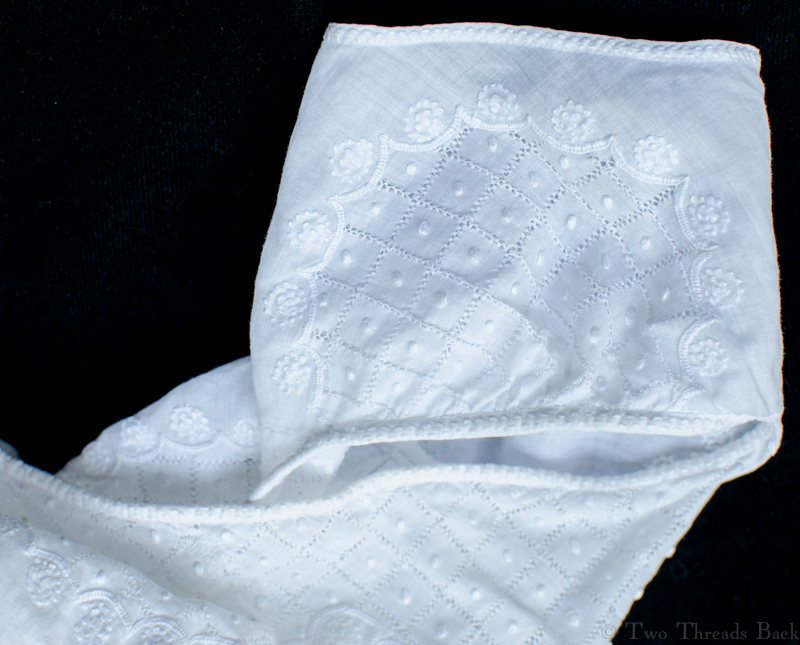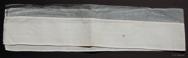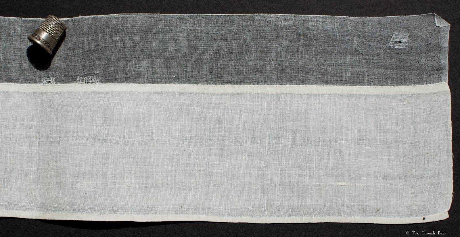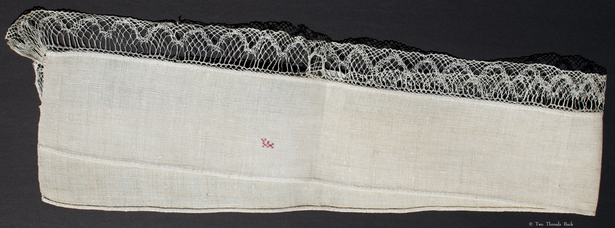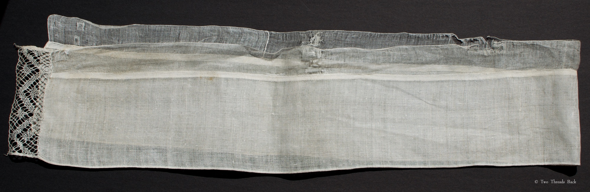 There’s a bit of lace on one end only, and a cambric border on one edge. You can see there’s also a good bit of wear.