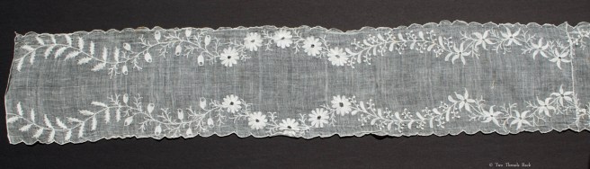 Now here are the four long strips of linen that perplex me, ornamented along one edge, all owned by a woman who lived from 1760-1805, in France. They measure a bit over 40″ long and the linen is @3.5″ wide. If they’re not tuckers, what the heck are they and how did she wear them? Maybe they were part of a headdress. Folk costume. Dresser scarf. Tourniquet with feminine flair.