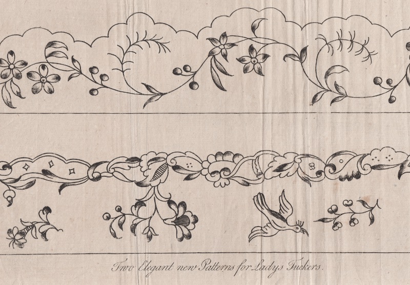 While on the subject of long narrow textiles, I’ll present my next puzzle: tuckers. I’m wandering into dangerous territory when discoursing on 18th century costume, since I know so little. However, I had no trouble finding period references to tuckers. Their wearing location on female anatomy guaranteed attention, one way or another.