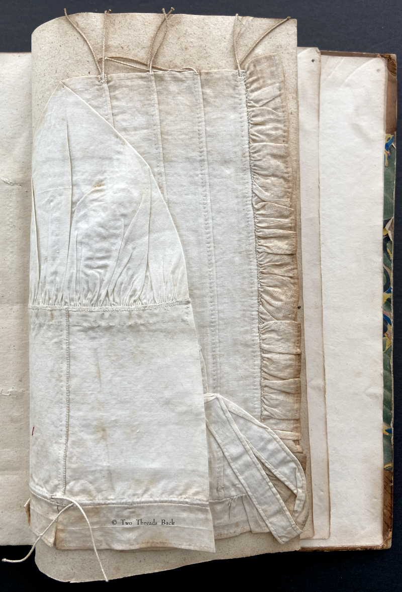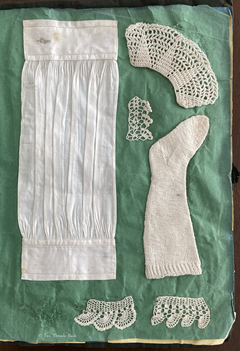 Two pairs of undersleeves were kept with the book. I assume they were Mary’s work because they have her initials marked in cross stitch. I’ve circled them in the photo to show how small they are. The sleeves show wear, so I don’t know if they were part of her sewing instruction or later work that stayed with her album.