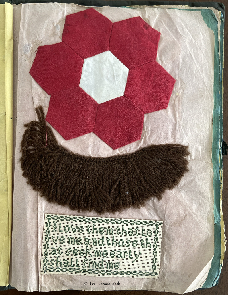 Nope, it’s not a walrus mustache. It’s some pretty (or not!) wool trim, useful for Victorians who didn’t know the meaning of restraint in decor. Mary also made a hexagon quilt patch and worked a scripture verse on punched paper. I don’t understand why 19th C needle workers seem so untroubled by words that run out of roo– m. Why???