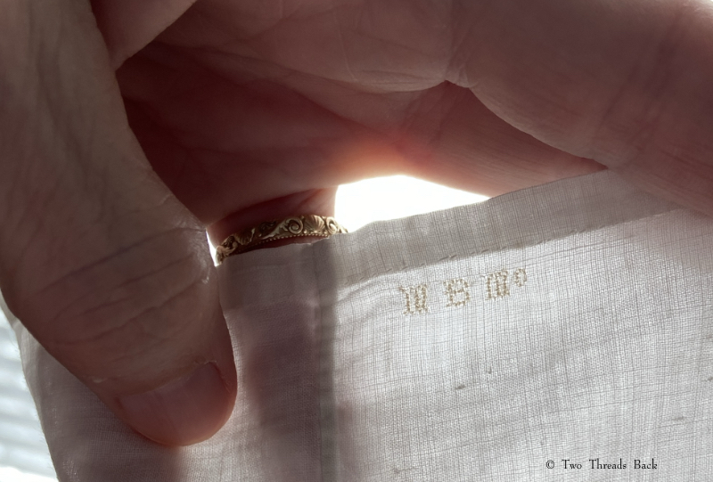 The marked initials are less than 4mm tall. I never cease to be amazed at the tiny stitches they could make. The letters look like M B Mc to me. McQuiston?