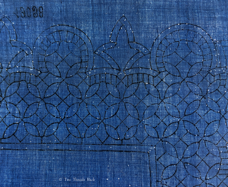 The largest piece is made of blue glazed cotton which appears to be stamped with a pattern, probably purchased from a shop. It has a pattern number (reversed) and a crown logo. It’s obviously been used. I wonder if the finished project is still tucked in a drawer somewhere or in a stack of old linens in an antique shop.