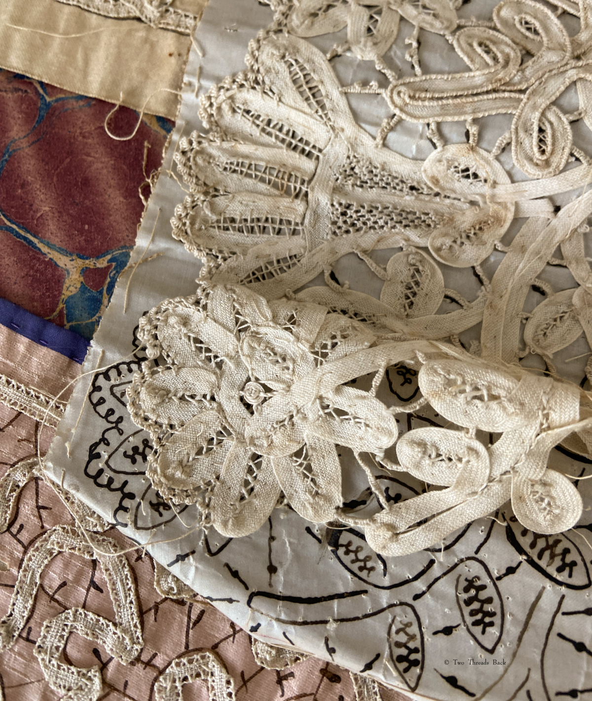 The collection comprises samples of unfinished work tacked to two layers of ground fabric. There’s one with a heavy canvas backing with a lighter cotton front, and two strips that are puzzling. They have a muslin back and pink glazed cotton front that has the lace pattern inked on it. What makes them unusual is that they’re constructed like old-fashioned sewing roll-ups (kits), bound with purple silk ribbon. You can see where they’ve had the tapes tacked to the pattern and then clipped off in places. Were they used for teaching? For reference? They’d be easy to roll up neatly and carry in a work box or bag! Or maybe they just allowed Nanny to work on a length of lace at a time, untack it, and then do another, while the “roll-up” kept the fabrics together and prevented raveling?