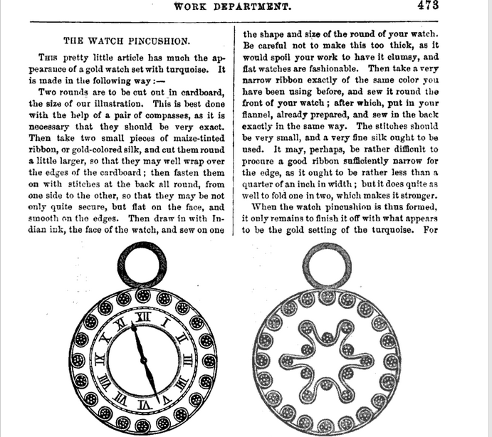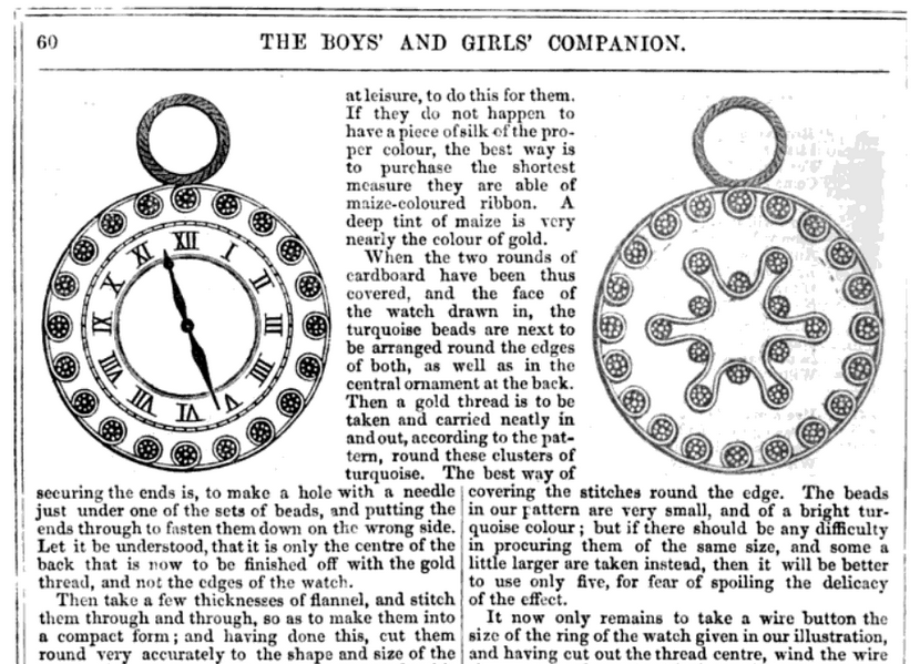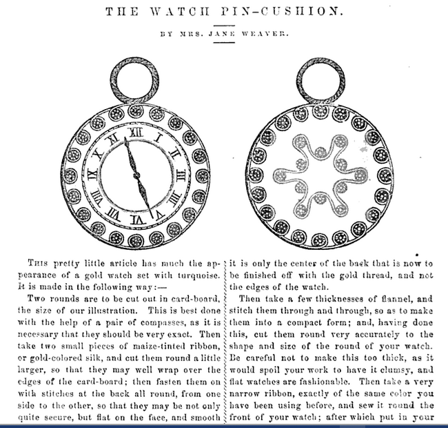 Back to Googlebooks for an English source. And indeed, I located another pattern published earlier, in England. The Boys’ and Girls’ Companion featured the watch pin cushion, this time credited to Madame Eugenie, in 1857. And that’s where I met a dead end.