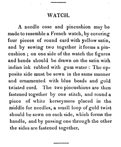 What are called “bachelor’s pin-cushions” are made very thin so that gentlemen can carry them in their pockets…. Two round pieces of paste-board are covered with silk, and neatly sewed together, with one or two thin pieces of flannel between them. Of course only one circle of pins can be put in.