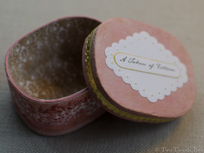 For this project, I was inspired by the little paper boxes that have survived, usually rather tattered and worn, and the quaint phrases that commonly appeared on souvenirs and gifts. Suitable for buttons, needles, etc., it only required a papier-mâché box, glue, paint, Dresden trim, and patterned paper. Oh, and I used a purchased label, gussied up with a gold pen.
